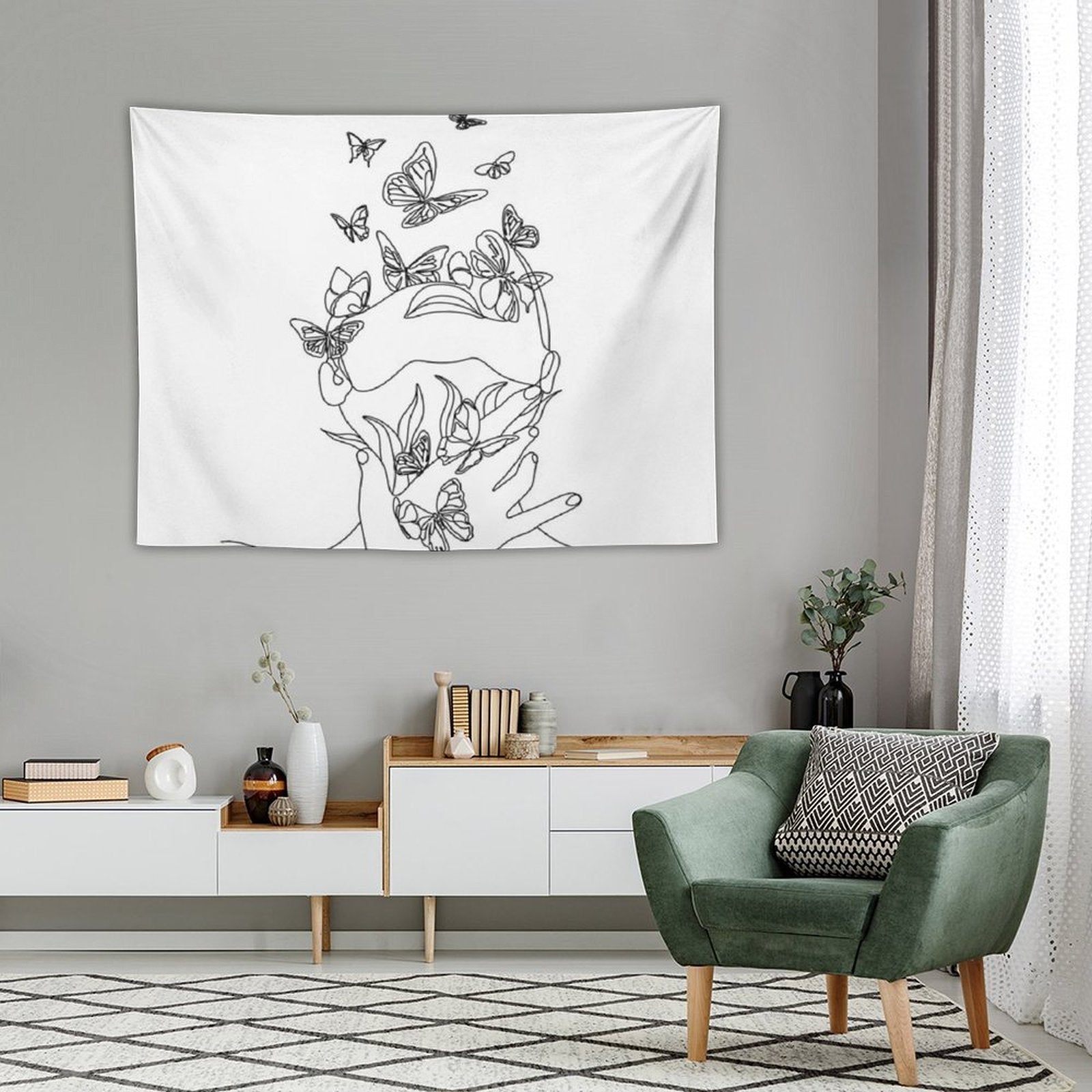 💕【ACCESSORY STRUCTURE】 "Abstract Face with Butterfly by One Line Drawing. Portrait Minimalistic Style. Botanical Print. Nature Symbol of Cosmetics. Mod Tapestry" (lock edge), with 2 barb clips and 3 no trace nail hooks, the two ends of the wall blanket can be fixed on the wall, convenient installation, will not destroy the wall.