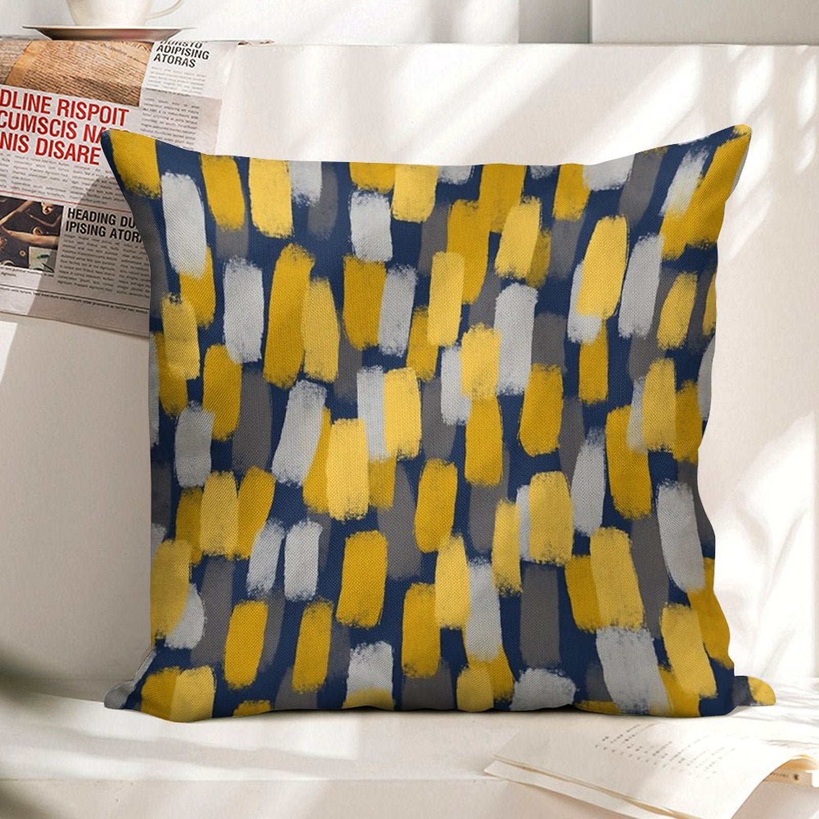 - Machine or hand washable (max 45°C). Avoid bleach and prolonged soaking to preserve the vibrant texture of your Abstract Grey And Mustard Yellow Paint Brush Effect on Navy Blue Luxury Pillow Cover.
