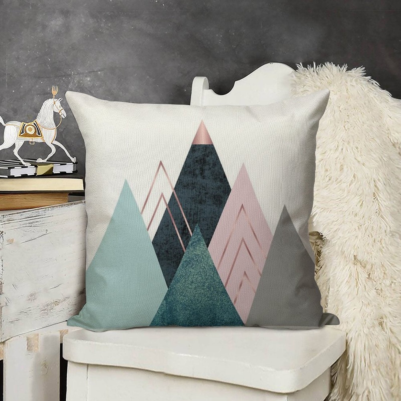 Abstract Minimalist Mountain - Pink, Teal And Blue Linen Throw Pillow Cover