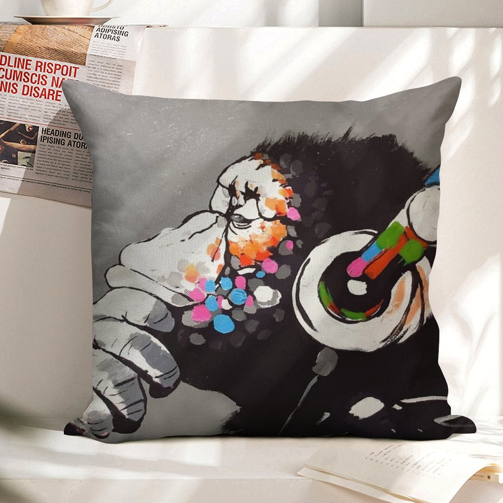 - Machine or hand washable (max 45°C). Avoid bleach and prolonged soaking to preserve the vibrant texture of your Banksy DJ Monkey Thinker with Headphones Luxury Pillow Cover.