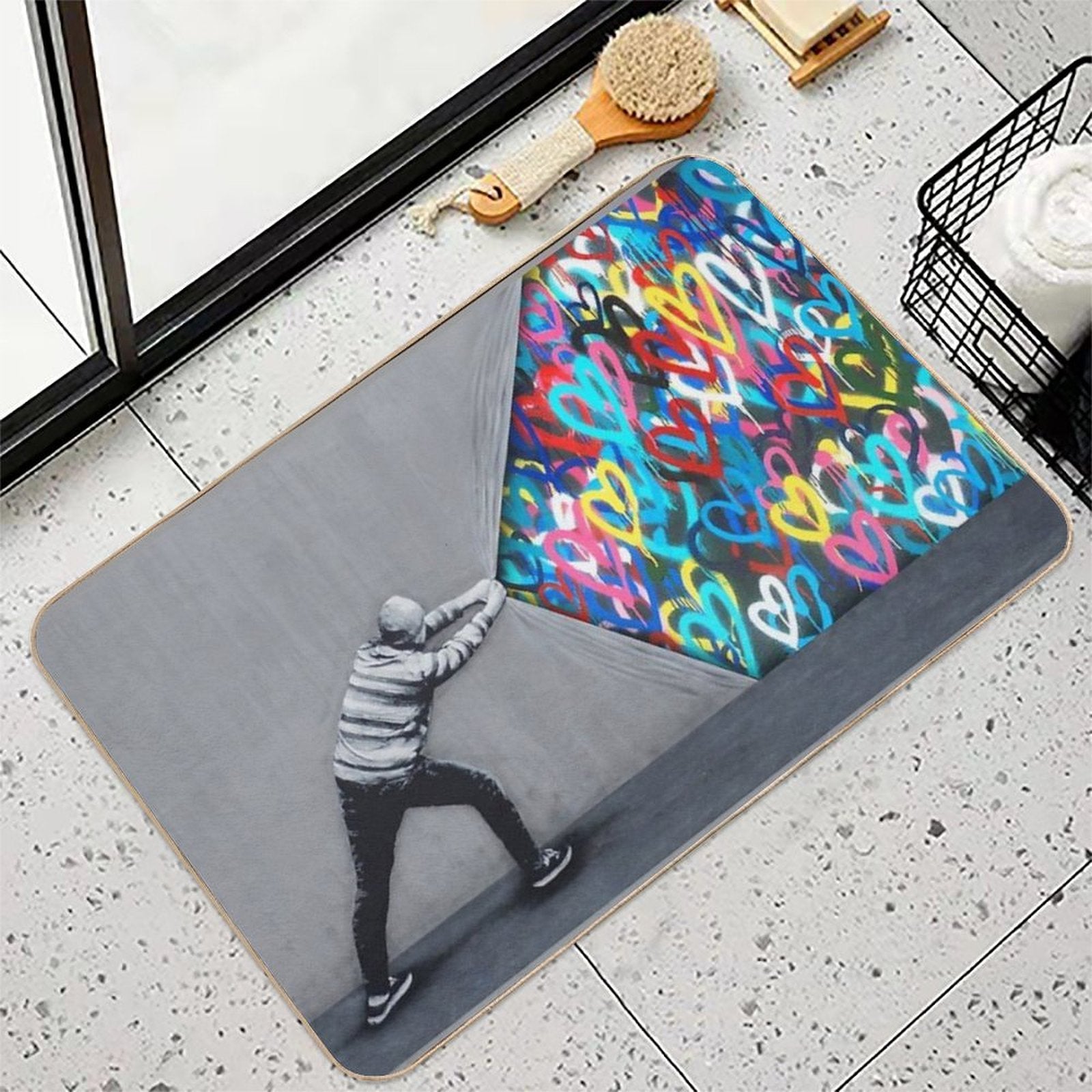 - Use as a vanity rug, guest suite accent, or mudroom defender – the Behind The Curtain Graffiti Hearts Spray Paint Art Mat adapts to any space.