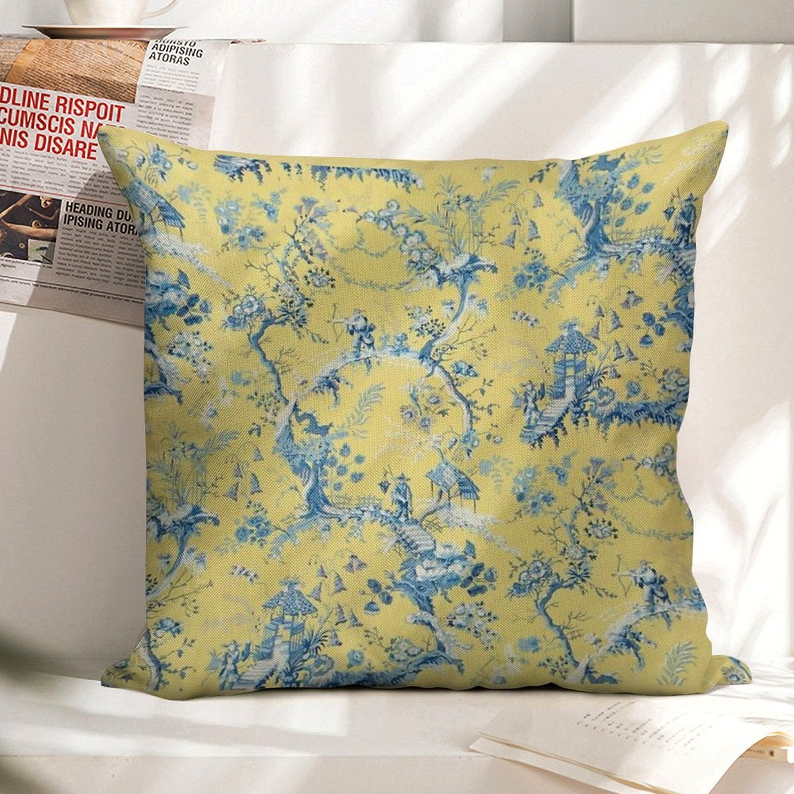 - Machine or hand washable (max 45°C). Avoid bleach and prolonged soaking to preserve the vibrant texture of your Blue And Yellow Toile Luxury Pillow Cover.