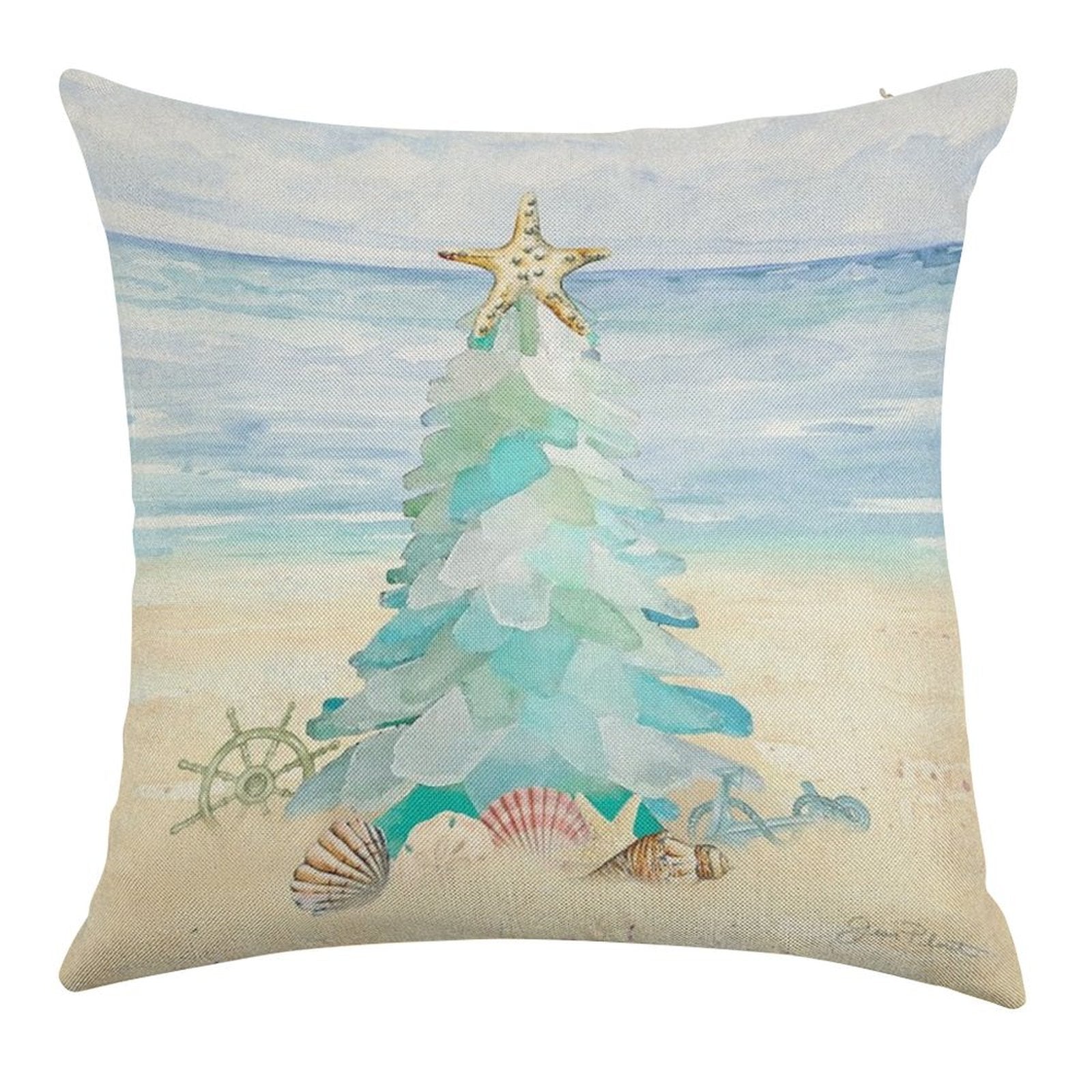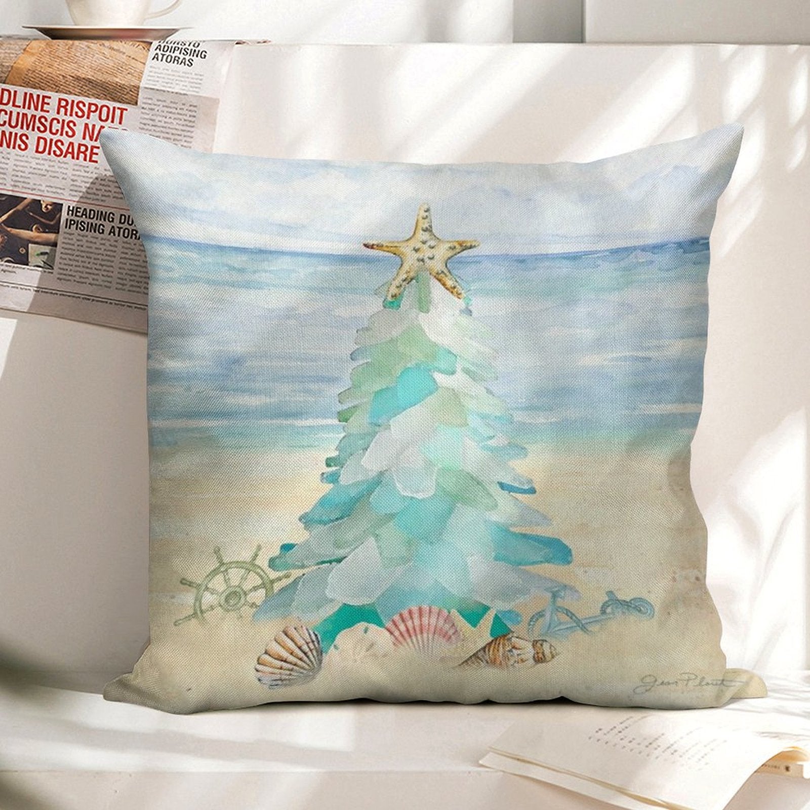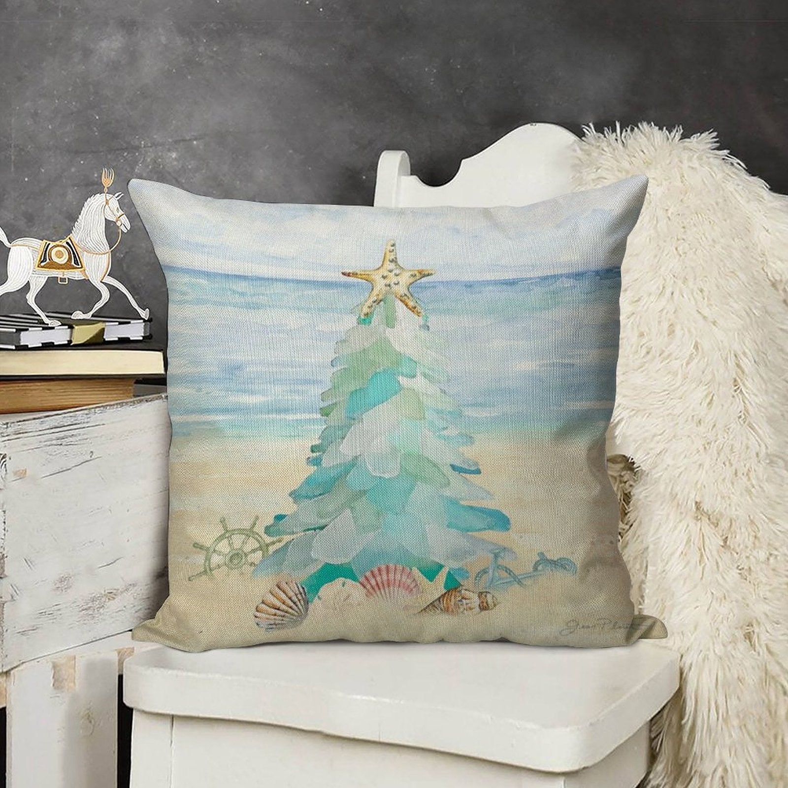 Coastal Seaglass Christmas Tree B Linen Throw Pillow Cover