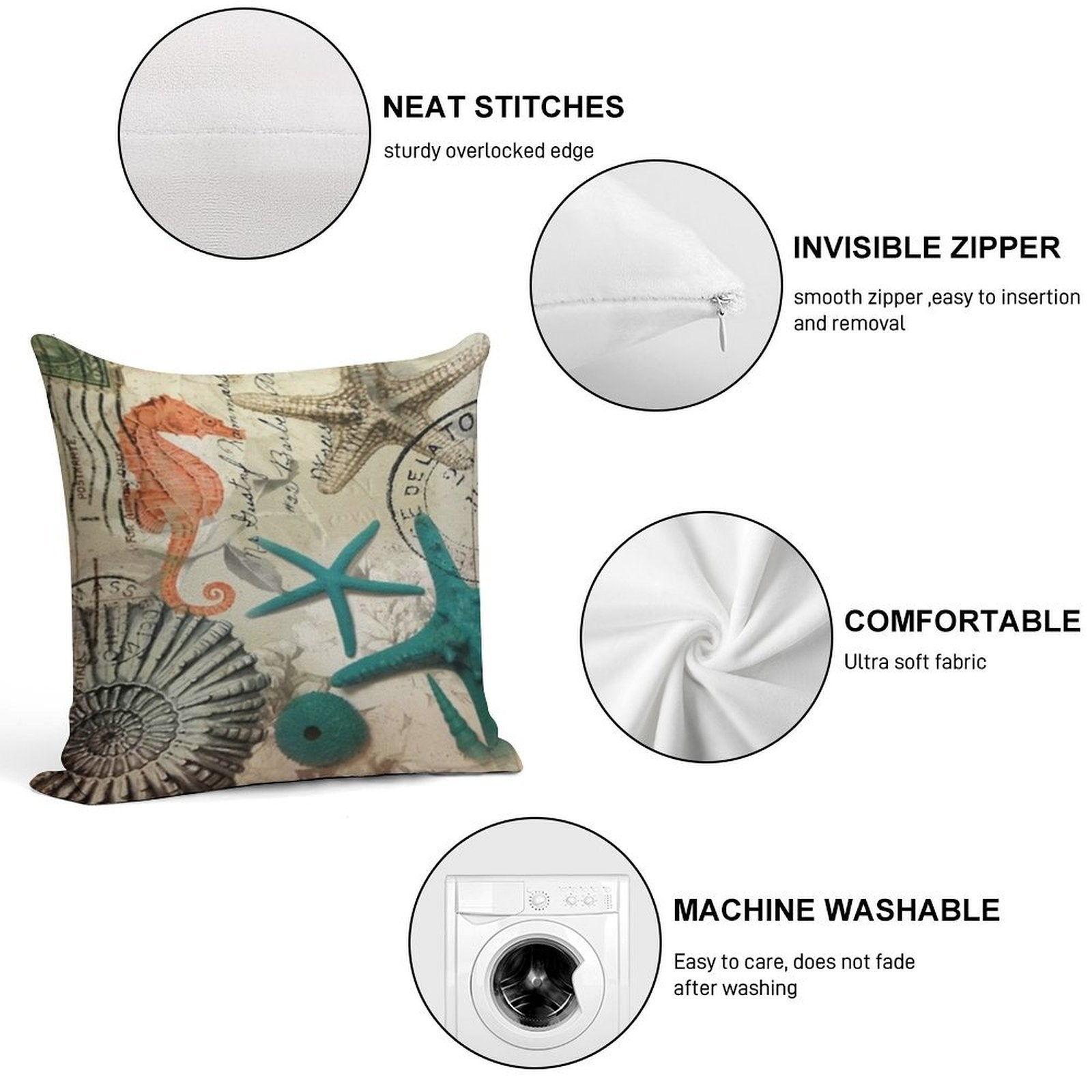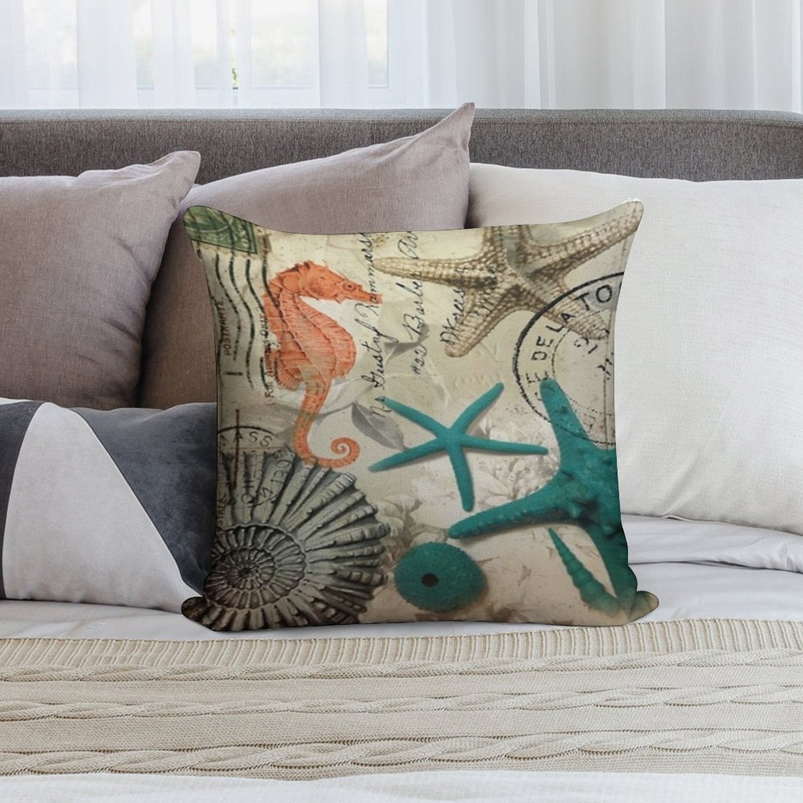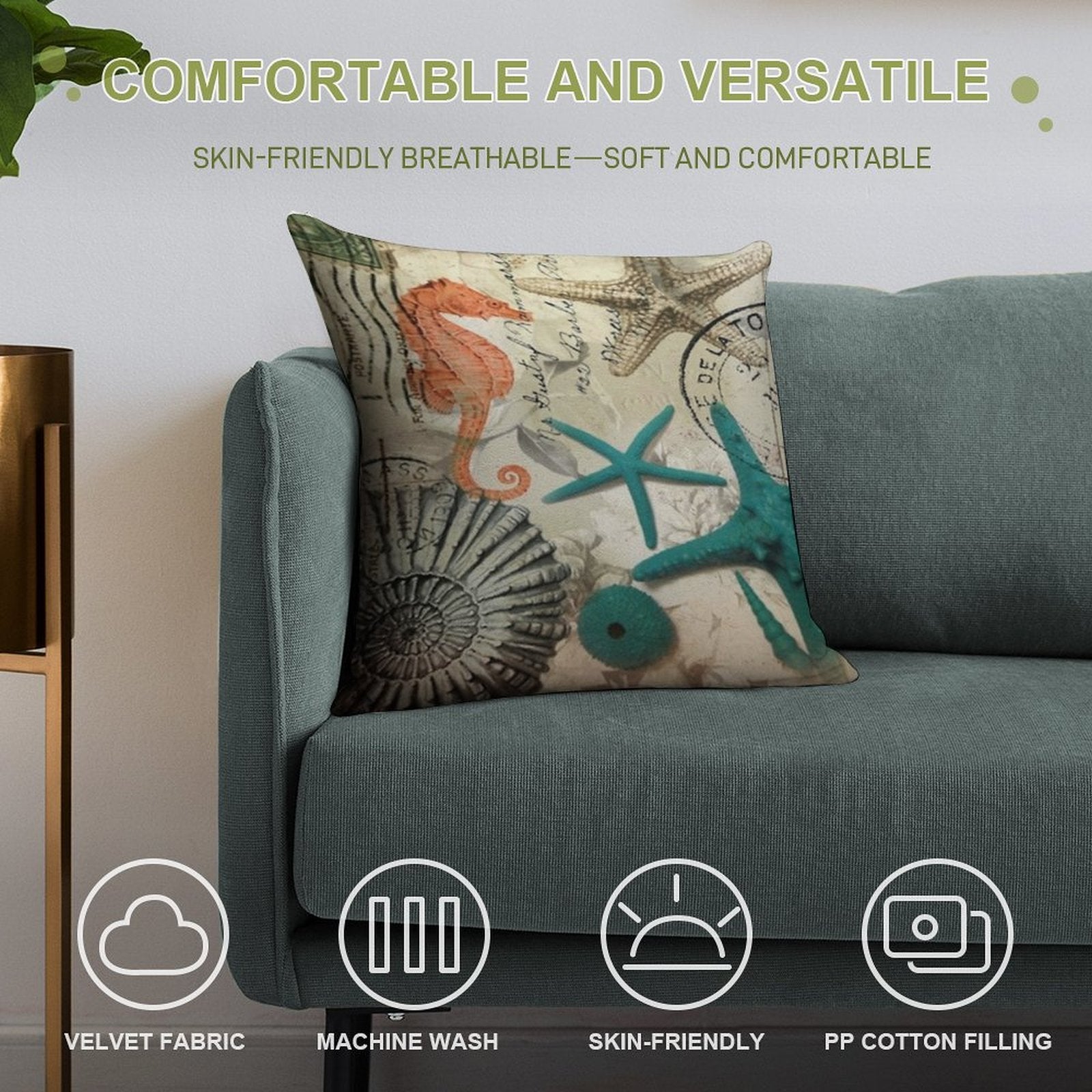 Dark Academia Coastal Seashell Teal Starfish Seahorse Ocean Beach Soft Short Plush Fabric Throw Pillow