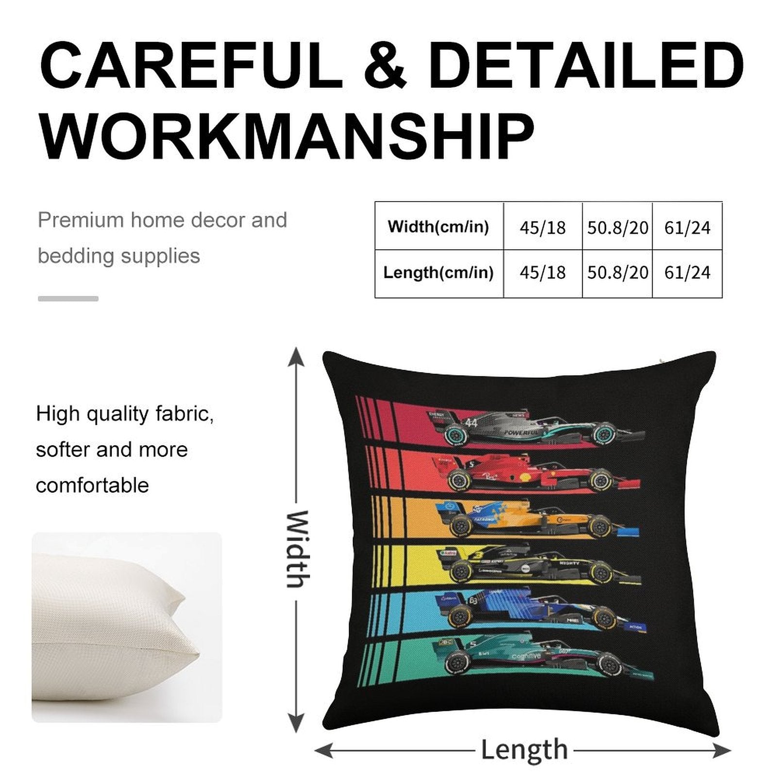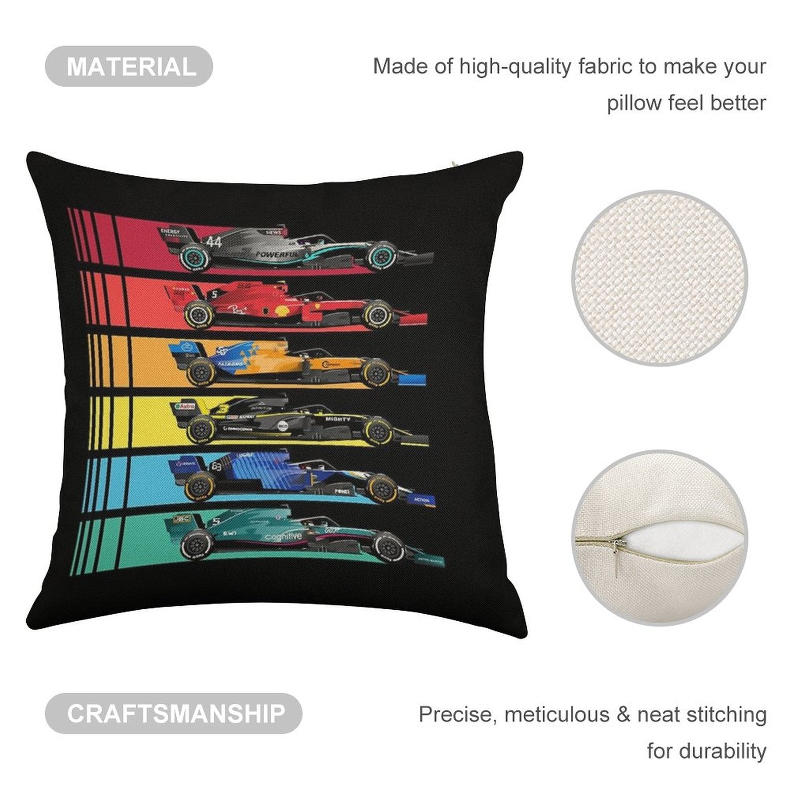 - Machine or hand washable (max 45°C). Avoid bleach and prolonged soaking to preserve the vibrant texture of your Formula Racing Cars 2023 Luxury Pillow Cover.