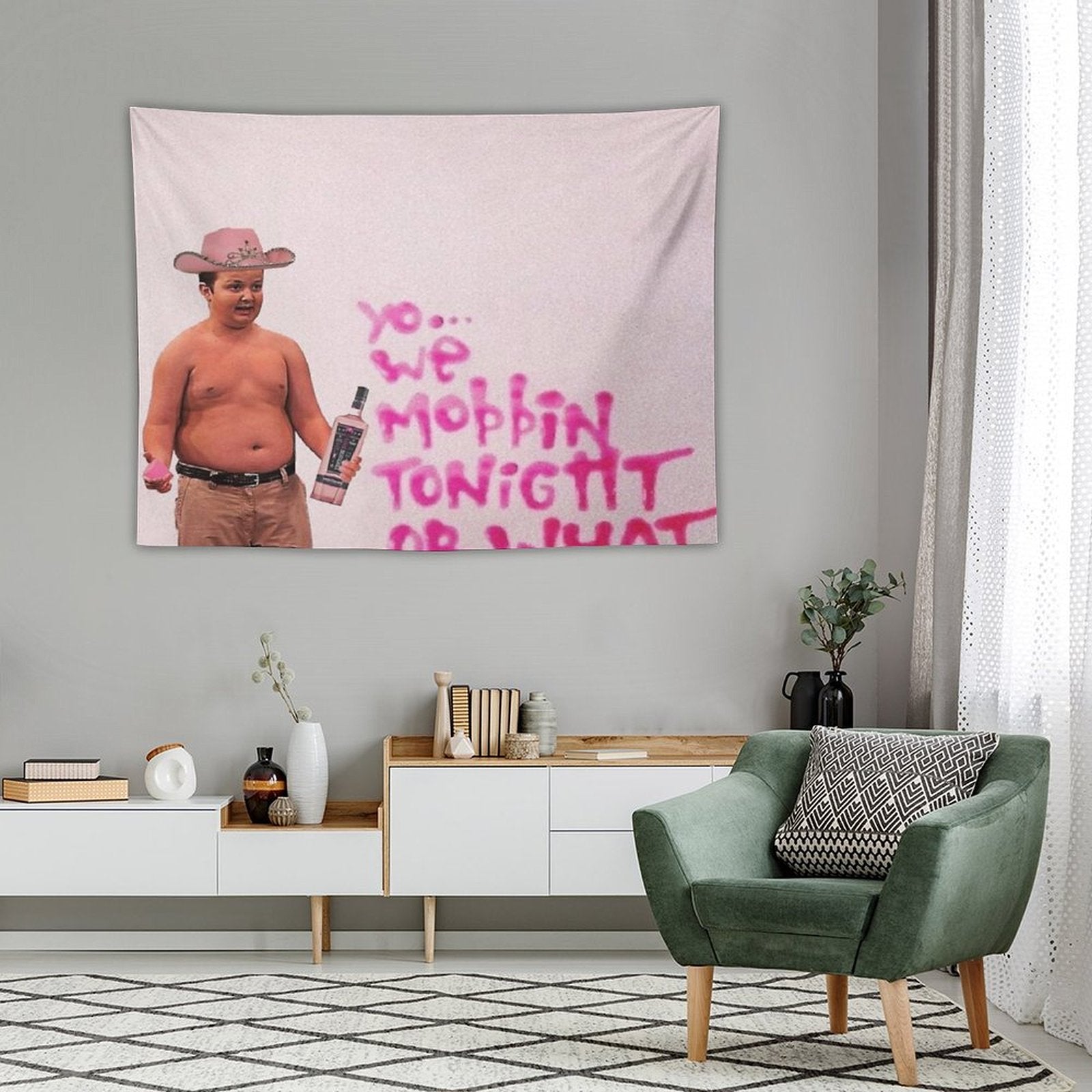 BionZax's Gibby Pink Cowboy Hat Mobbin Or What Tapestry for Bedroom, College Dorm. Gibby Pink Cowboy Hat Mobbin Or What Tapestry to decorate your bedroom, college dorm, living room, or kitchen wall, it is the best gift for funny, meme, aesthetic, trendy, simple, fashion, music, abstract, fantasy, modern tapestry for girls, men, boys, teen, women, kids.