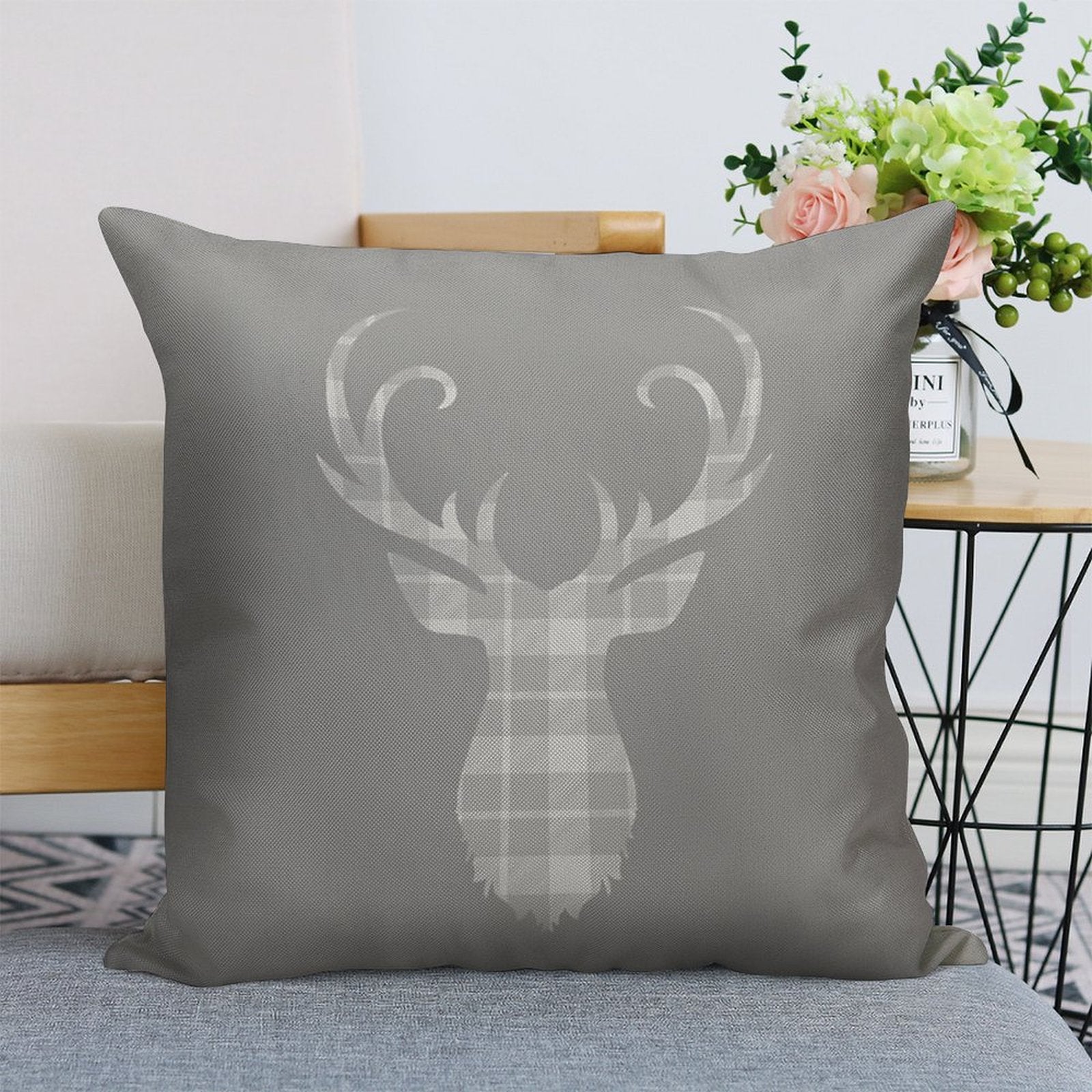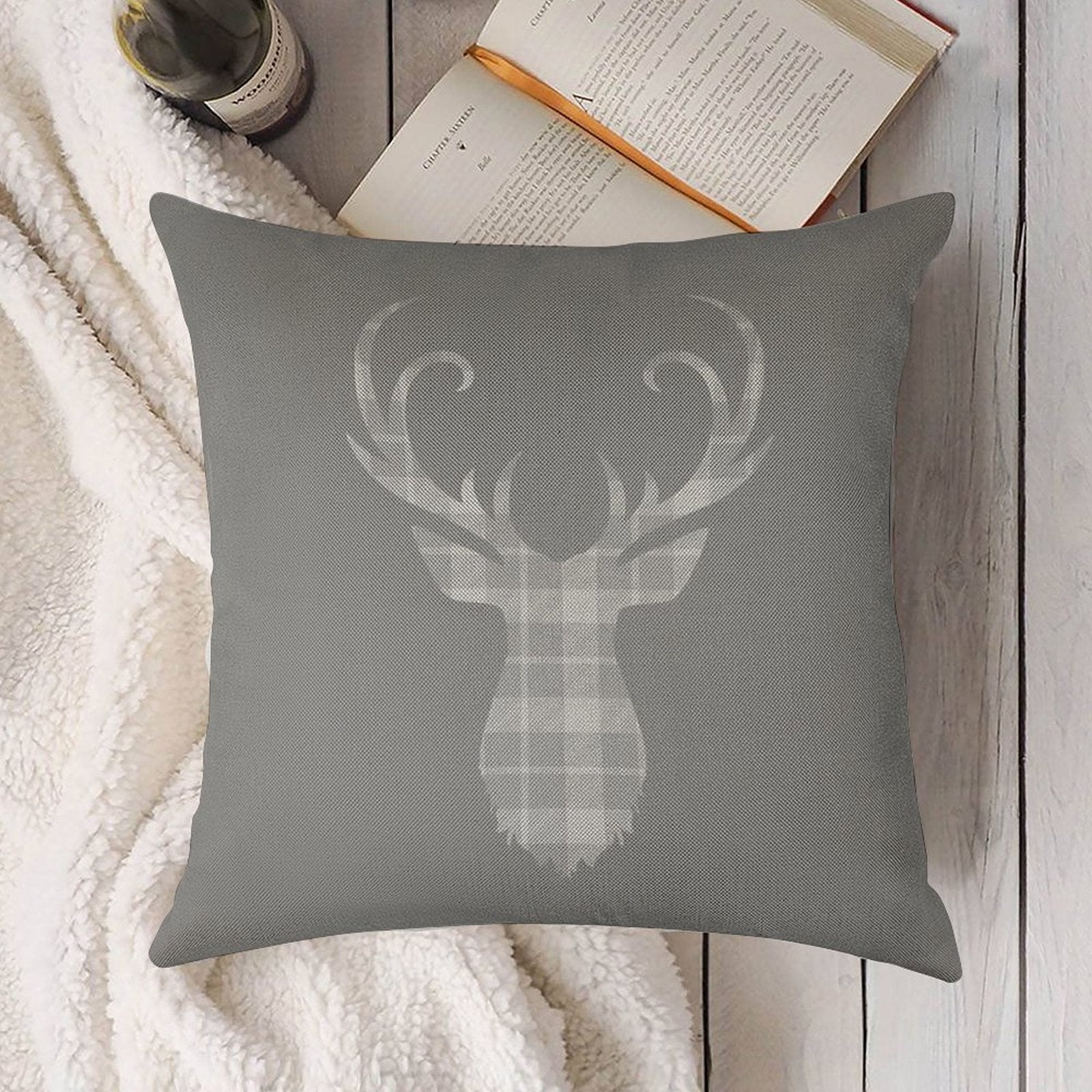 Grey Tartan Stag Head Linen Throw Pillow Cover