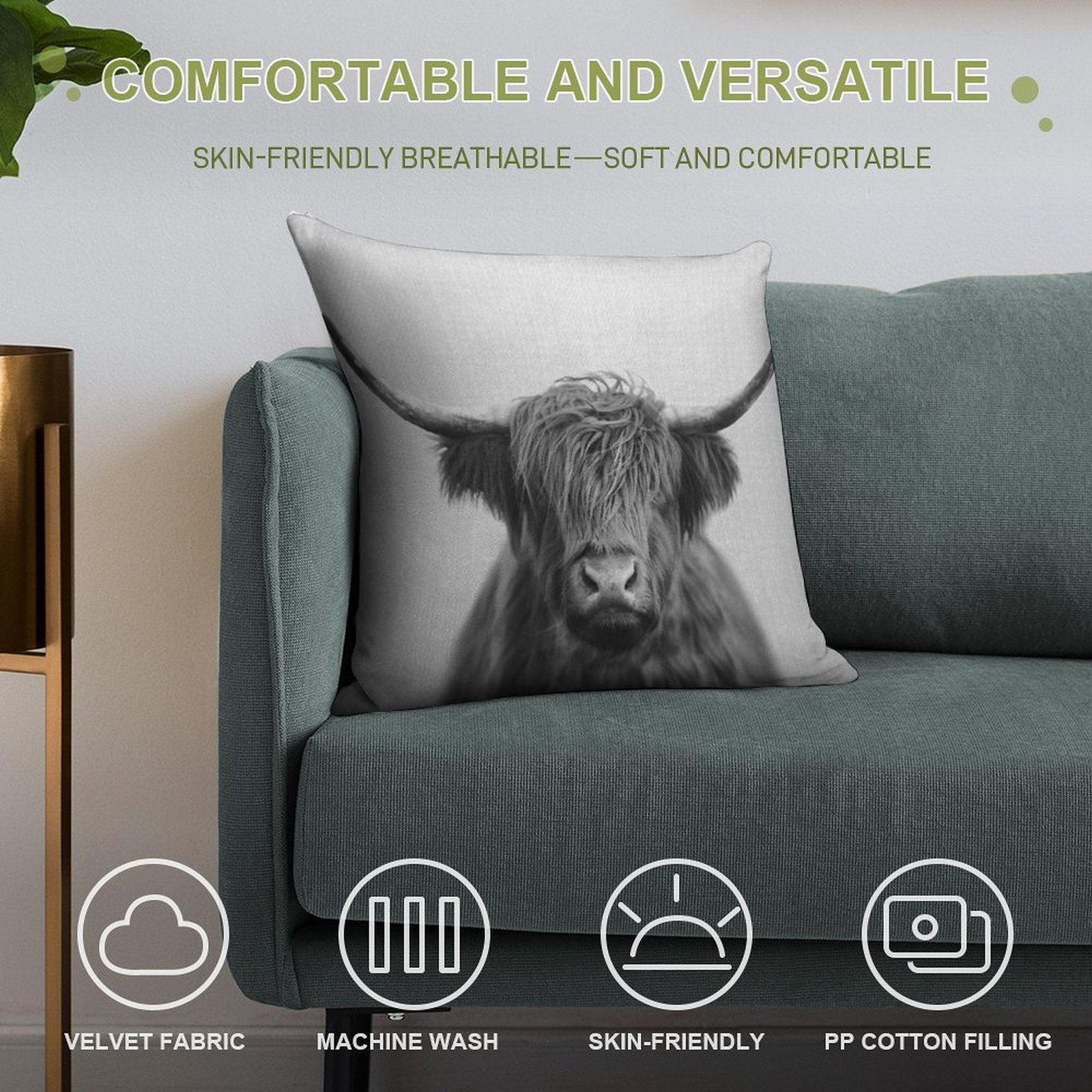 Highland Cow - Black & White Soft Ultra-Soft Texture Throw Pillow