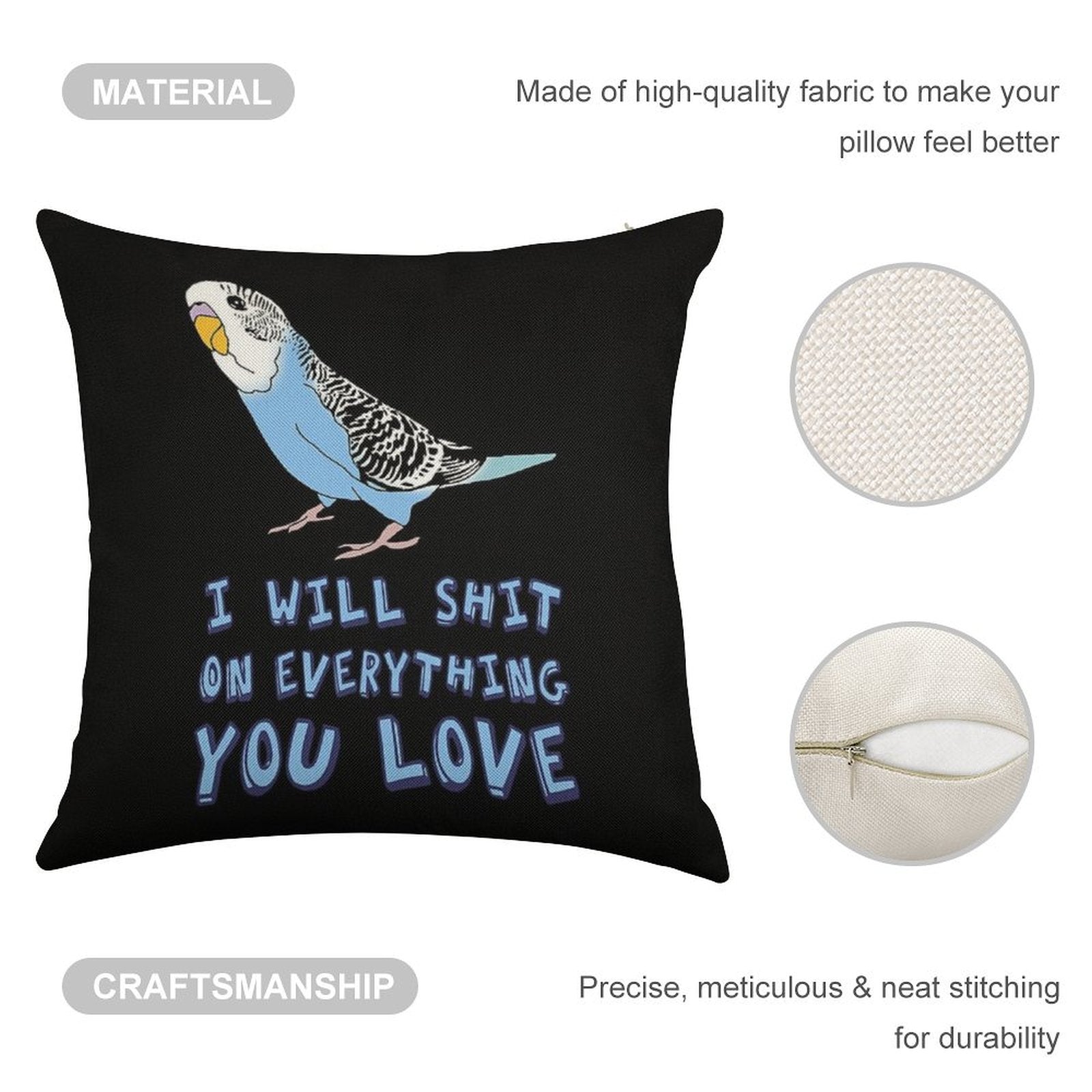 Upgrade your living space with our I Will Shit on Everything You Love - Blue Budgie Linen Throw Pillow Cover, blending timeless elegance and modern functionality. Crafted from breathable, durable linen-cotton fabric, this I Will Shit on Everything You Love - Blue Budgie Customizable Home Decor Gift features reinforced edges and a hidden zipper for a flawless finish. Perfect for bedrooms, RVs, or vacation homes, our I Will Shit on Everything You Love - Blue Budgie Luxury Pillow Cover offers versatility and style, making it ideal for everyday use or heartfelt gifting.