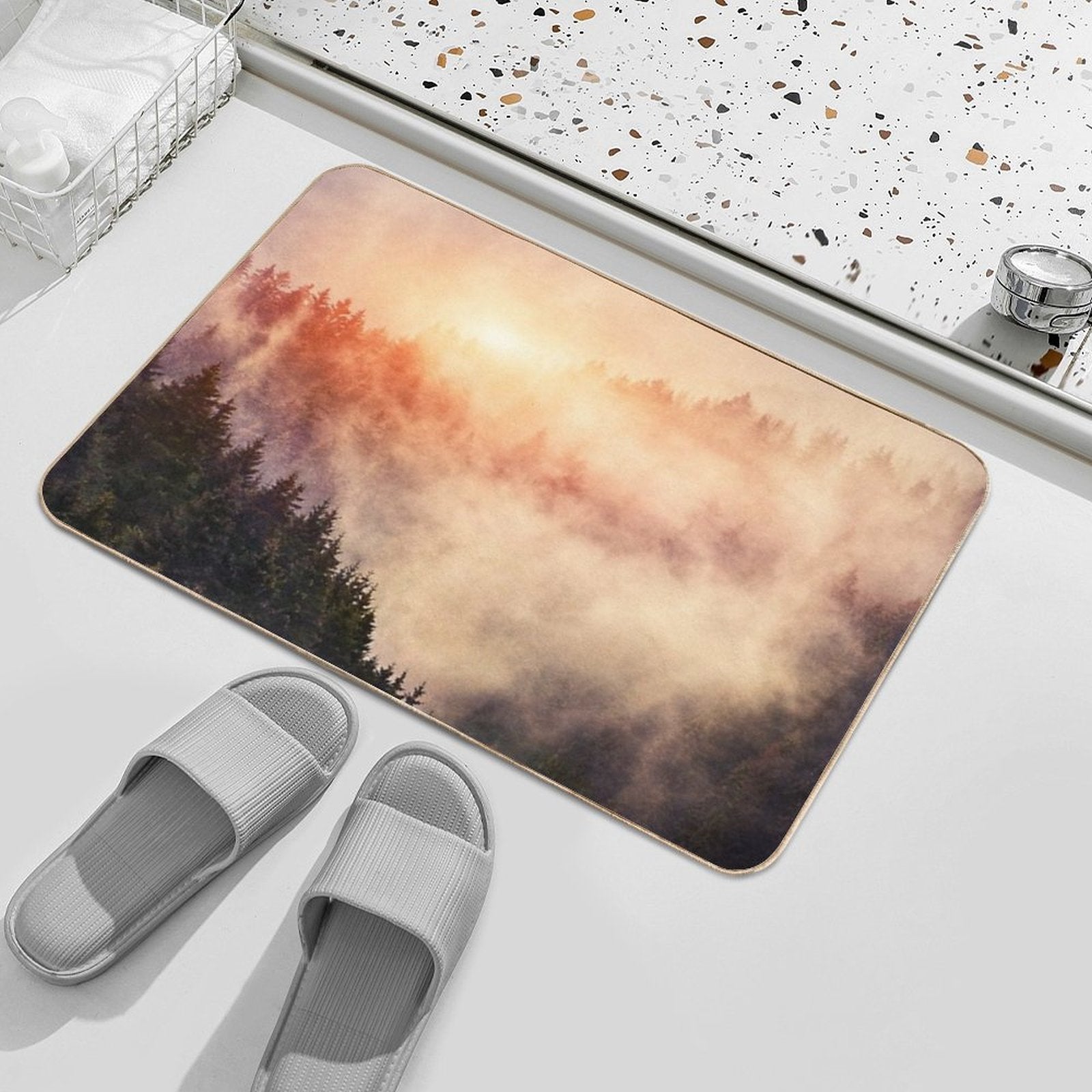 Secure Your In My Other World Sunrise In A Romantic Misty Foggy Autumn Fairytale Wilderness Forest With Trees Covered In Fog And Sunlight Mat Today – [Shop Now] & Defend Floors in Style!