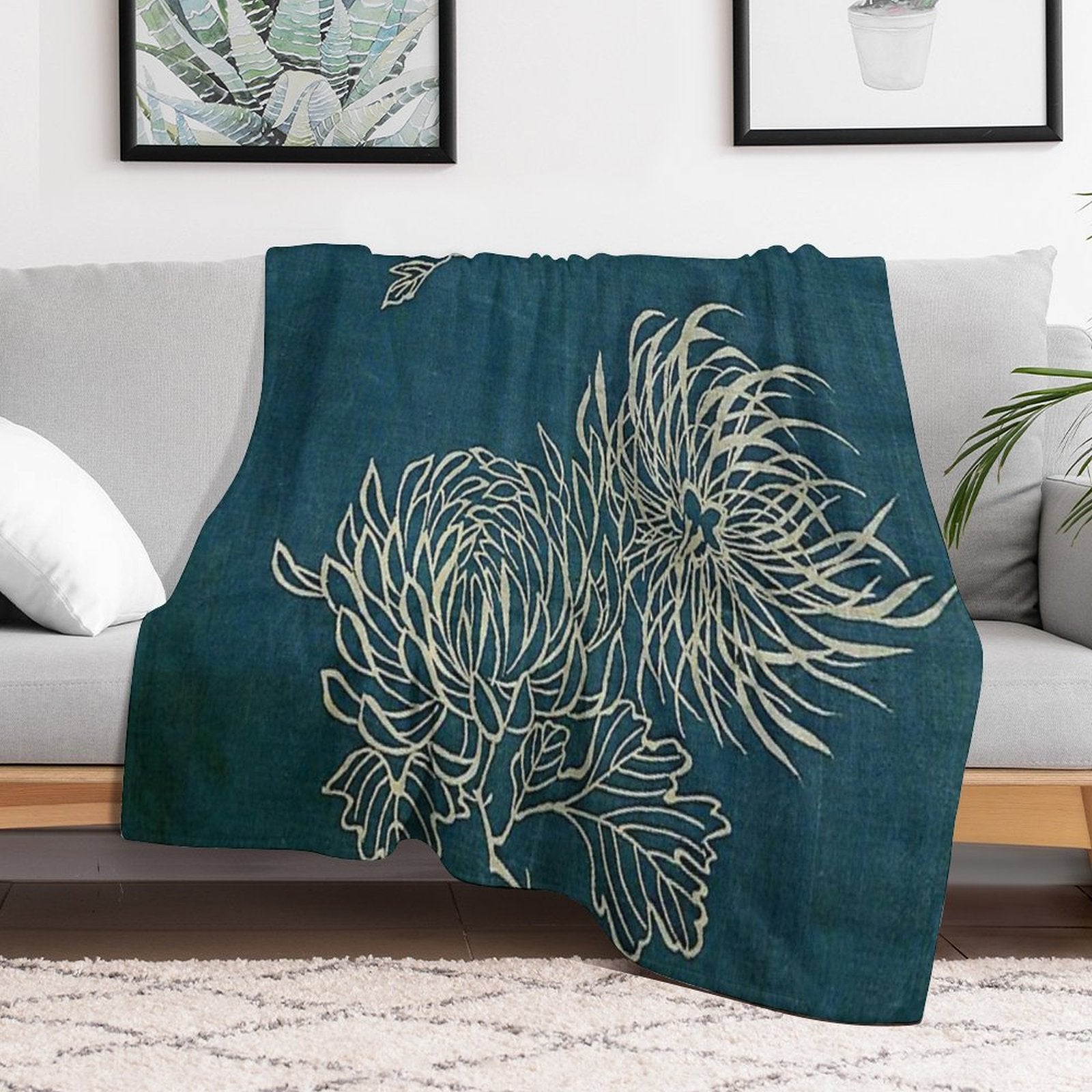 Japanese Textile Blue And White Lotus Flower Throw Blanket