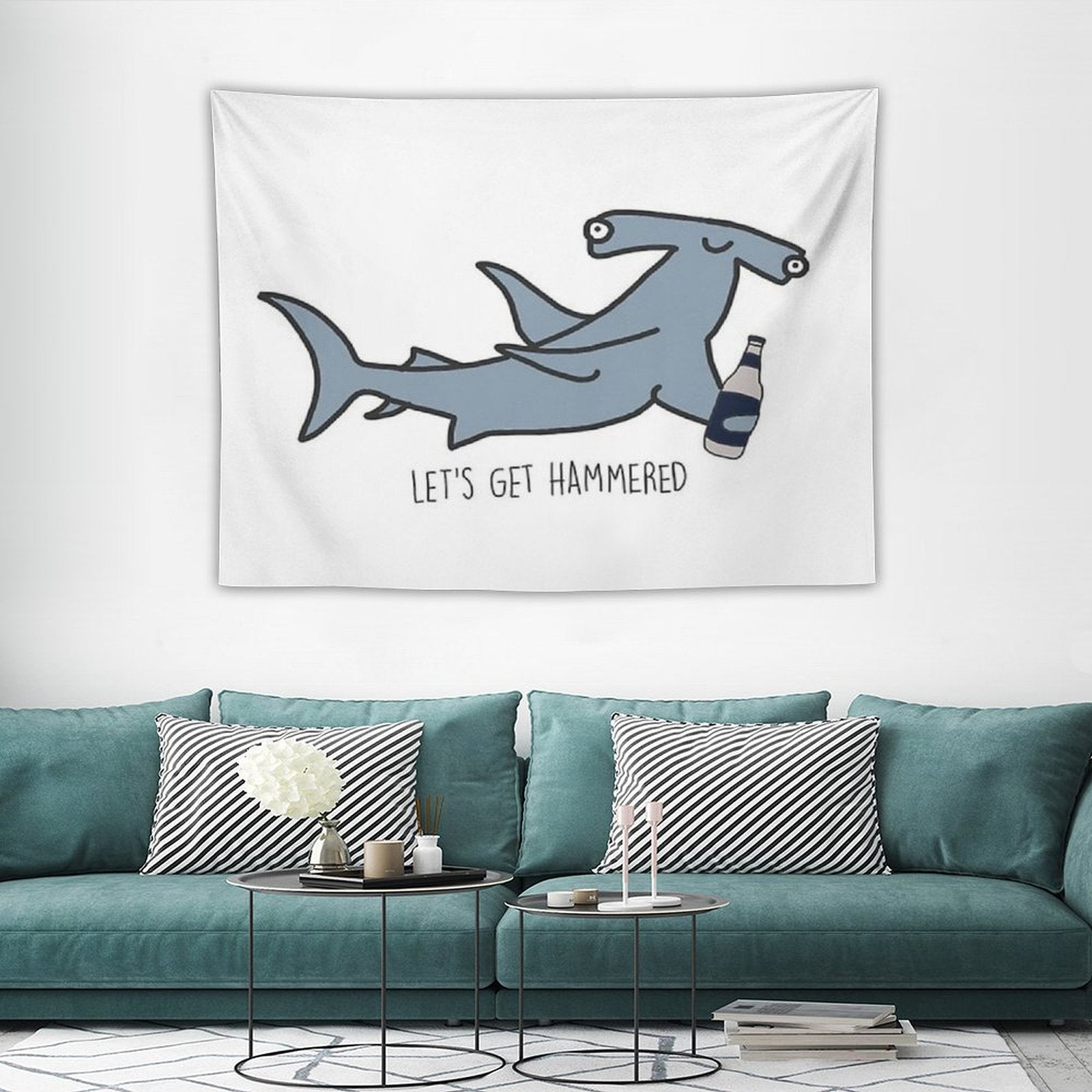 BionZax's Lets Get Hammered Hammerhead Shark Tapestry for Bedroom, College Dorm. Lets Get Hammered Hammerhead Shark Tapestry to decorate your bedroom, college dorm, living room, or kitchen wall, it is the best gift for funny, meme, aesthetic, trendy, simple, fashion, music, abstract, fantasy, modern tapestry for girls, men, boys, teen, women, kids.