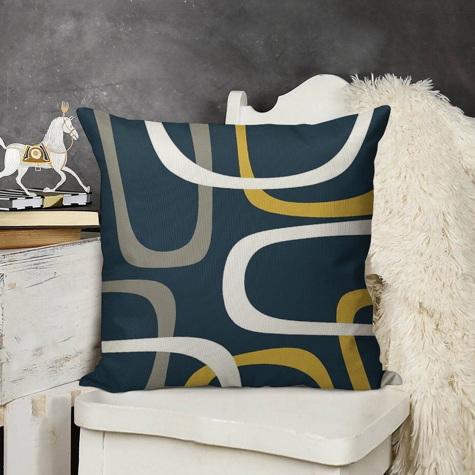 - Machine or hand washable (max 45°C). Avoid bleach and prolonged soaking to preserve the vibrant texture of your Midcentury Modern Loops Retro Pattern in Light Mustard, Grey, White, And Navy Blue Luxury Pillow Cover.