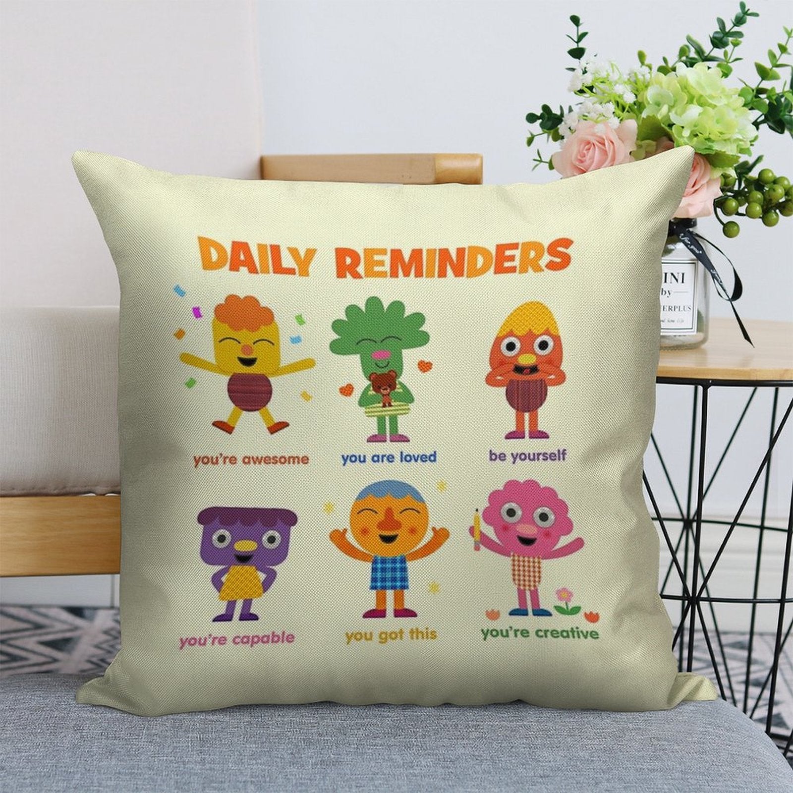 - Machine or hand washable (max 45°C). Avoid bleach and prolonged soaking to preserve the vibrant texture of your Noodle & Pals Daily Reminders Luxury Pillow Cover.