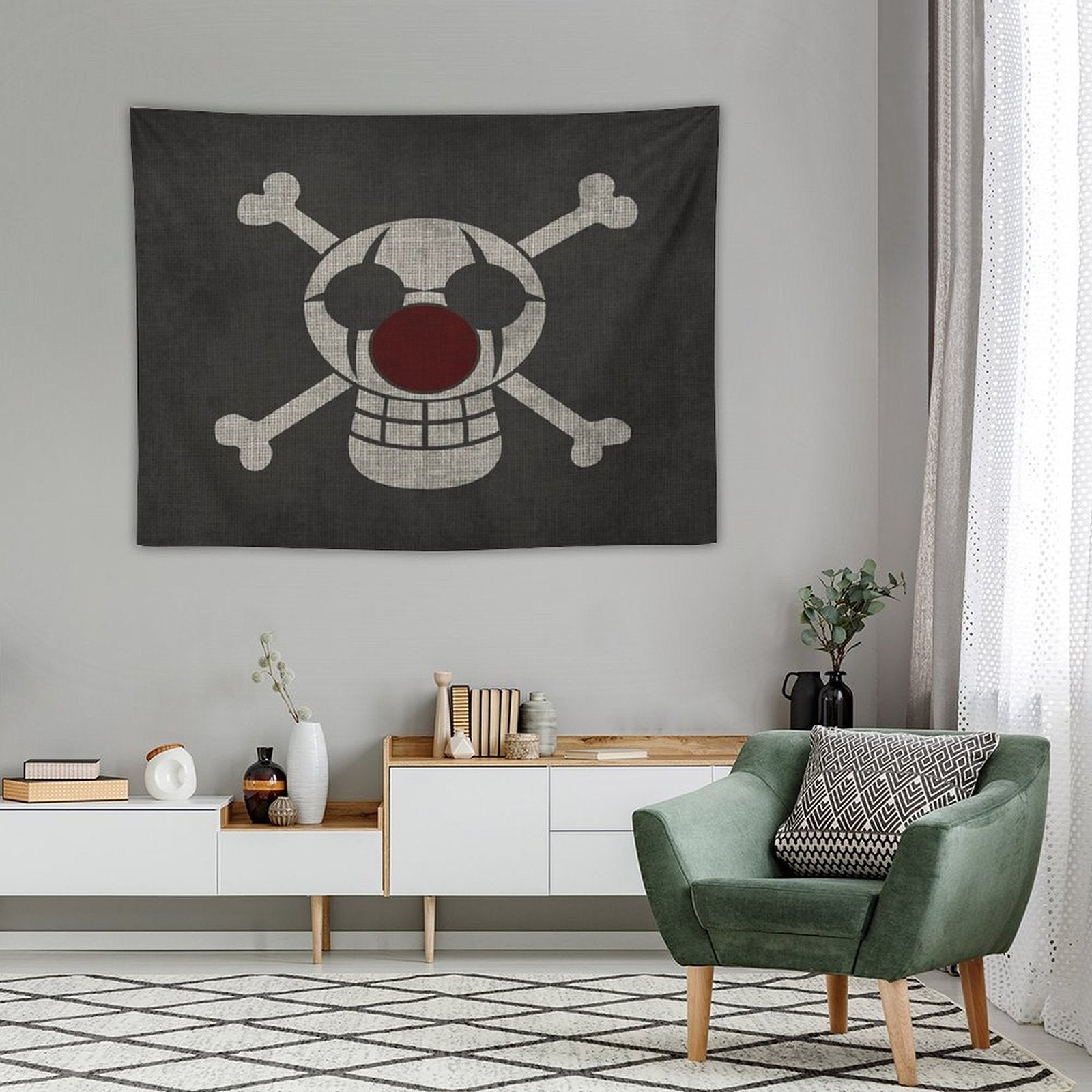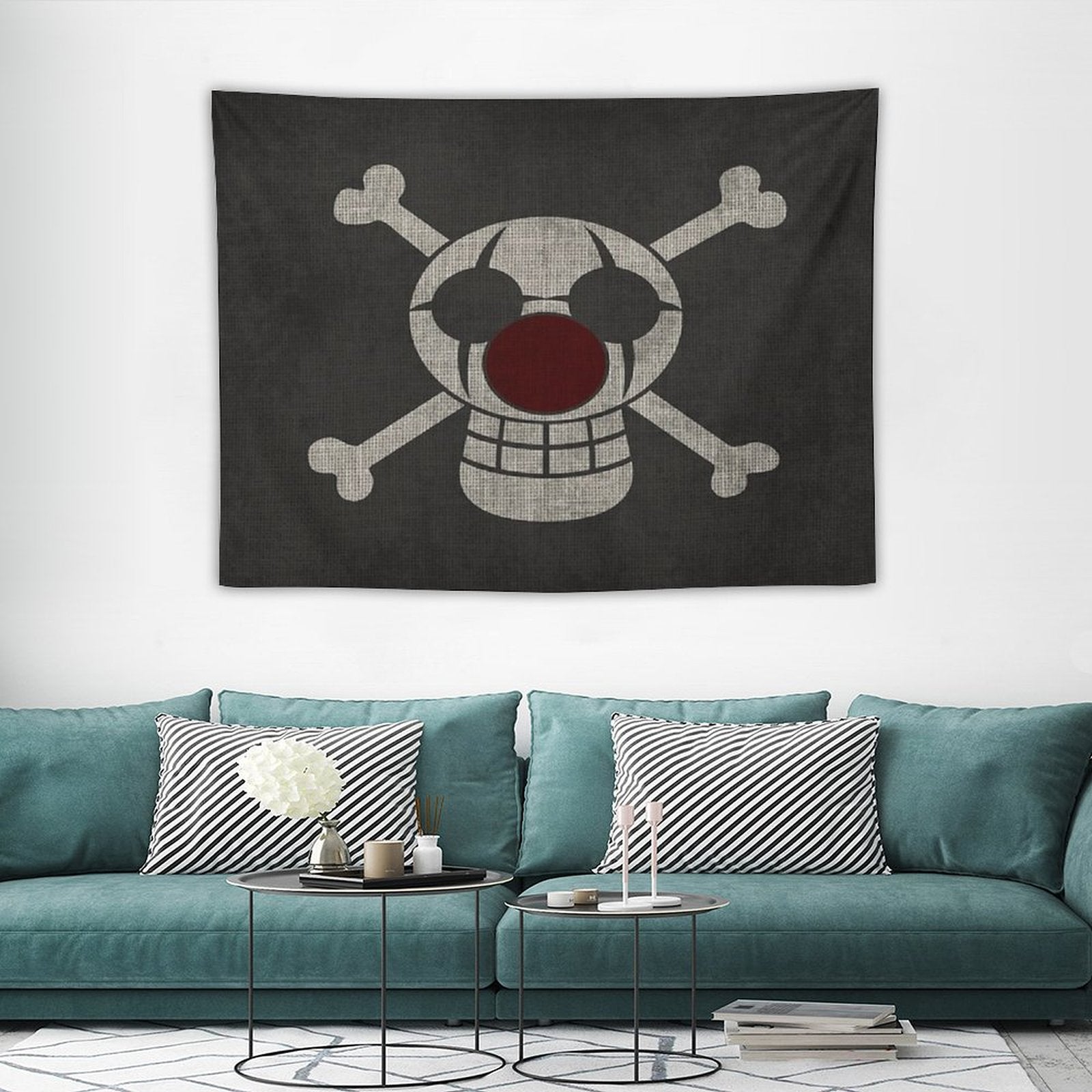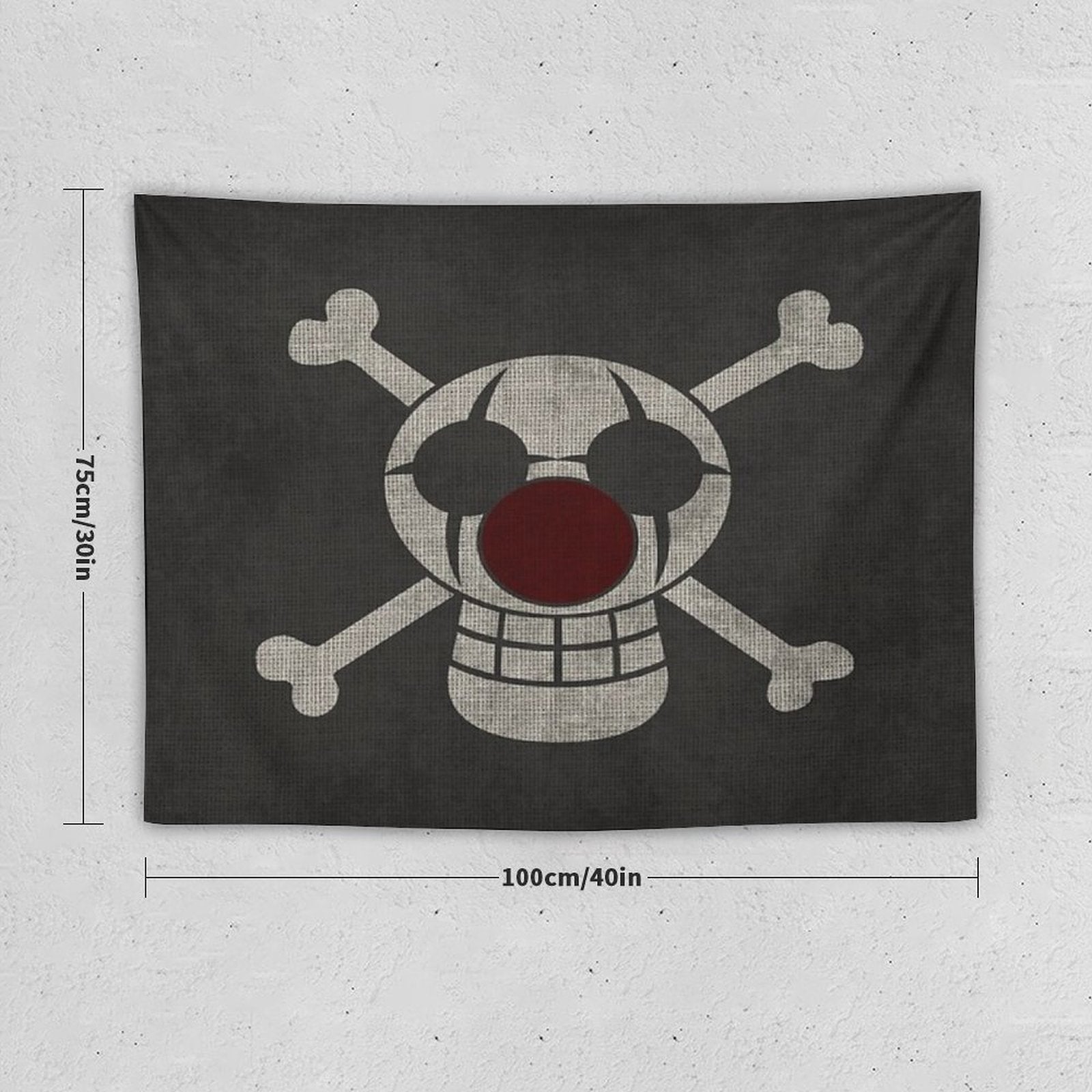 BionZax's OP 12 - Flag of The Buggy Pirates Tapestry for Bedroom, College Dorm. OP 12 - Flag of The Buggy Pirates Tapestry to decorate your bedroom, college dorm, living room, or kitchen wall, it is the best gift for funny, meme, aesthetic, trendy, simple, fashion, music, abstract, fantasy, modern tapestry for girls, men, boys, teen, women, kids.