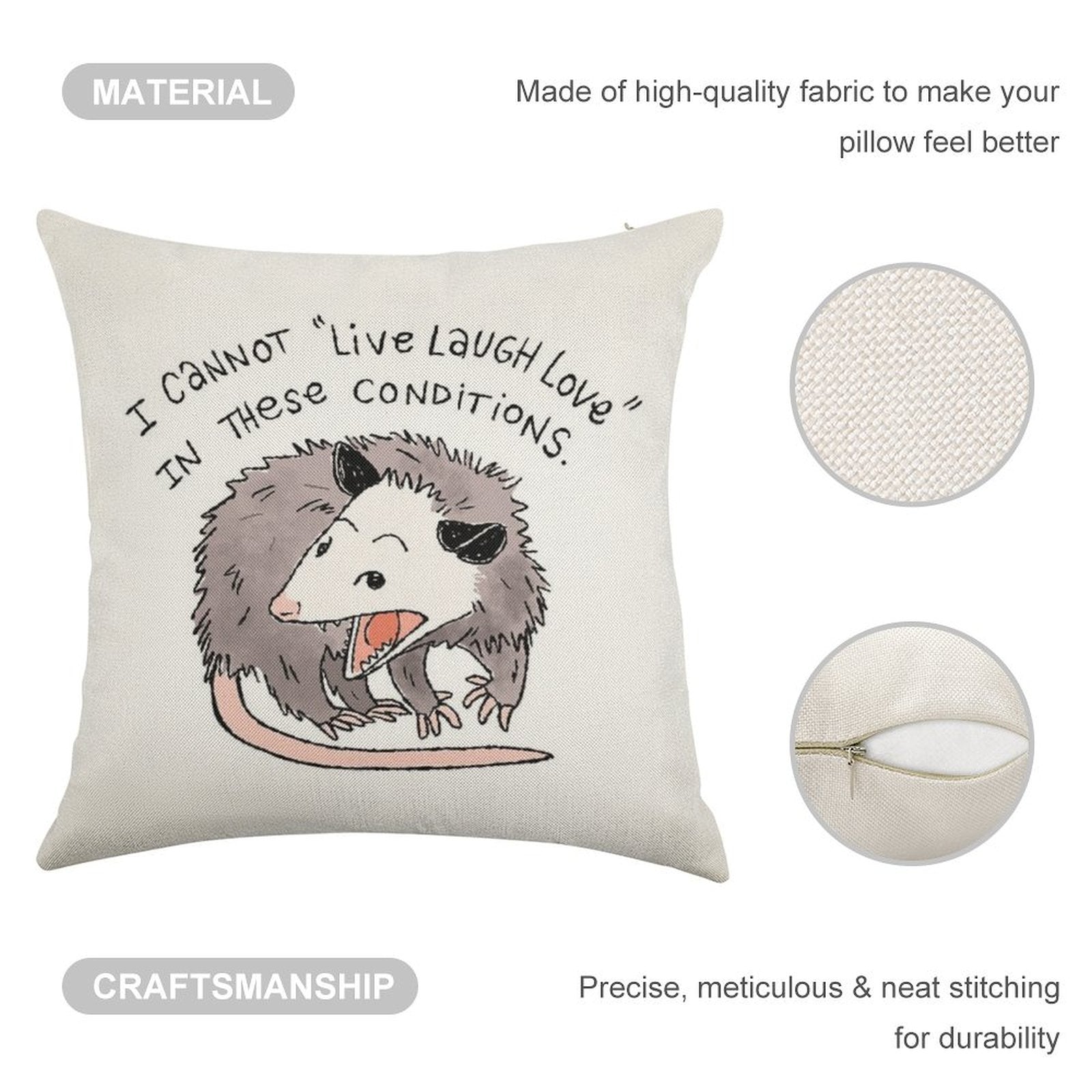 - Double-Stitched Edges: Precision stitching prevents fraying, stretching, and pilling, ensuring your Opossum Live Laugh Love Linen Throw Pillow Cover stays pristine through countless uses.