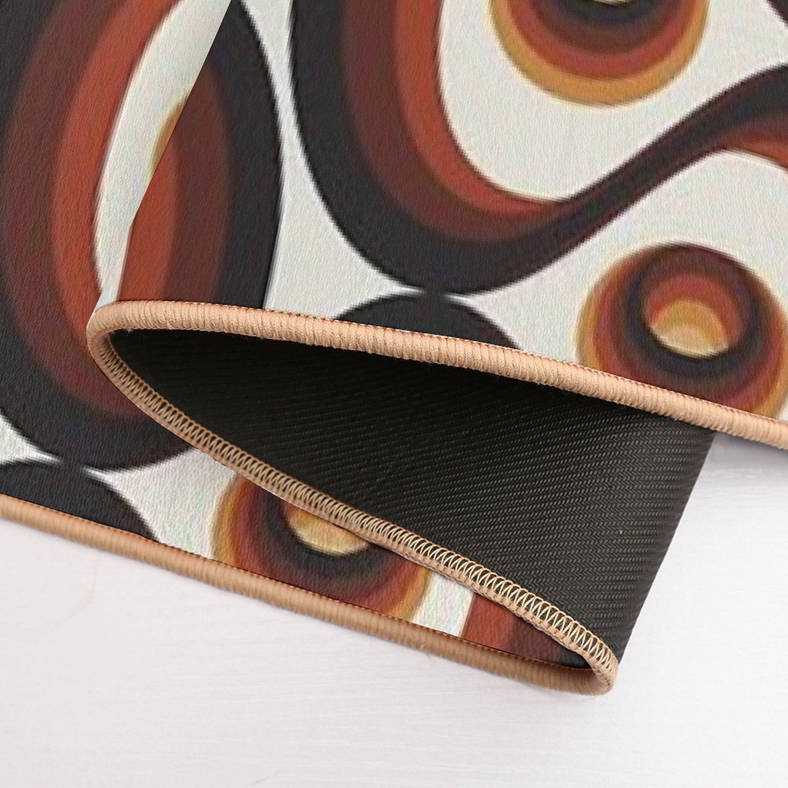 - Use as a vanity rug, guest suite accent, or mudroom defender – the Orange, Brown, And Ivory Retro 1960s Circular Pattern Mat adapts to any space.