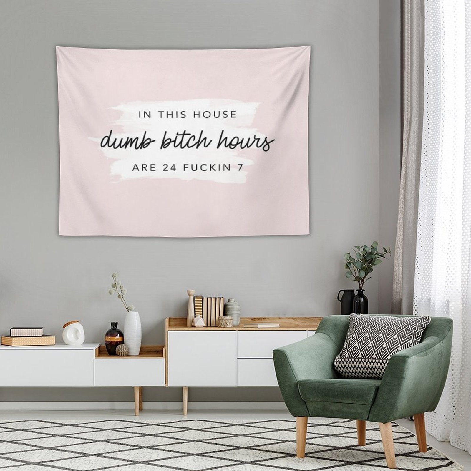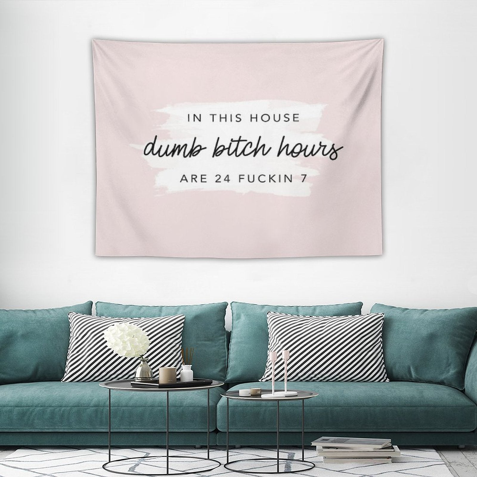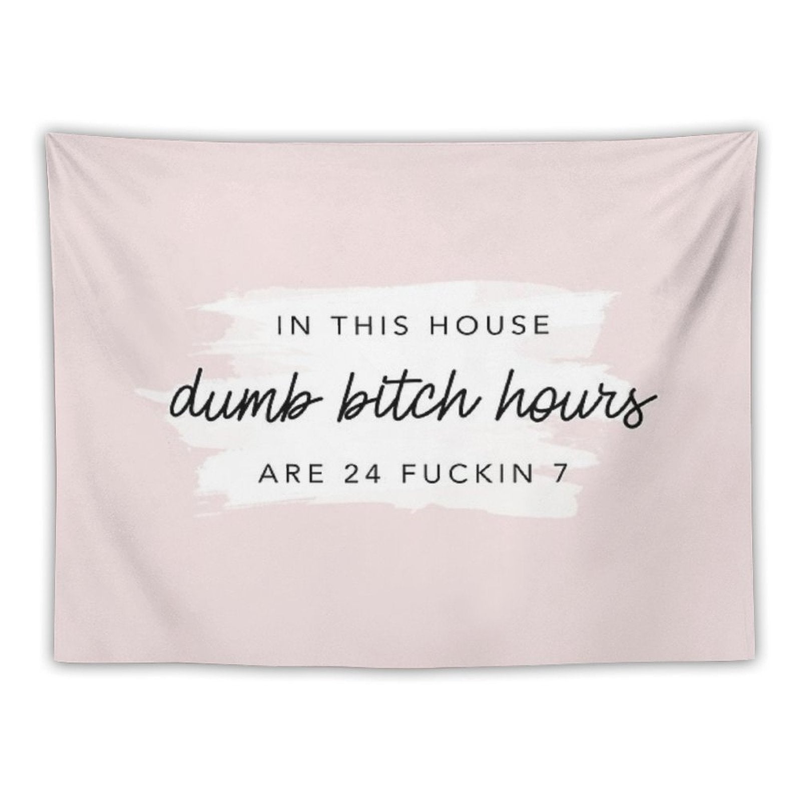 BionZax's Original In This House, Dumb Bitch Hours Are 24 Fuckin 7 Tapestry for Bedroom, College Dorm. Original In This House, Dumb Bitch Hours Are 24 Fuckin 7 Tapestry to decorate your bedroom, college dorm, living room, or kitchen wall, it is the best gift for funny, meme, aesthetic, trendy, simple, fashion, music, abstract, fantasy, modern tapestry for girls, men, boys, teen, women, kids.