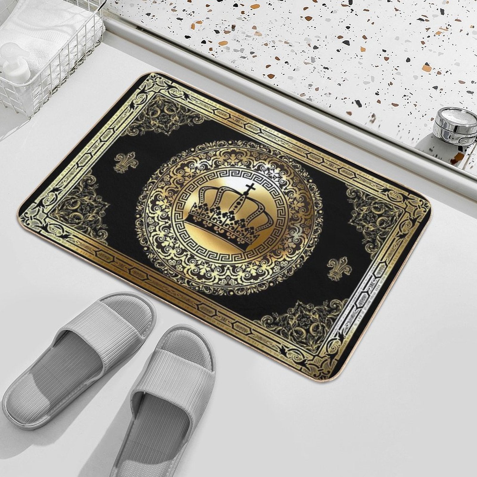 - Use as a vanity rug, guest suite accent, or mudroom defender – the Ornate Baroque Crown Black Gold Greek Key Mat adapts to any space.