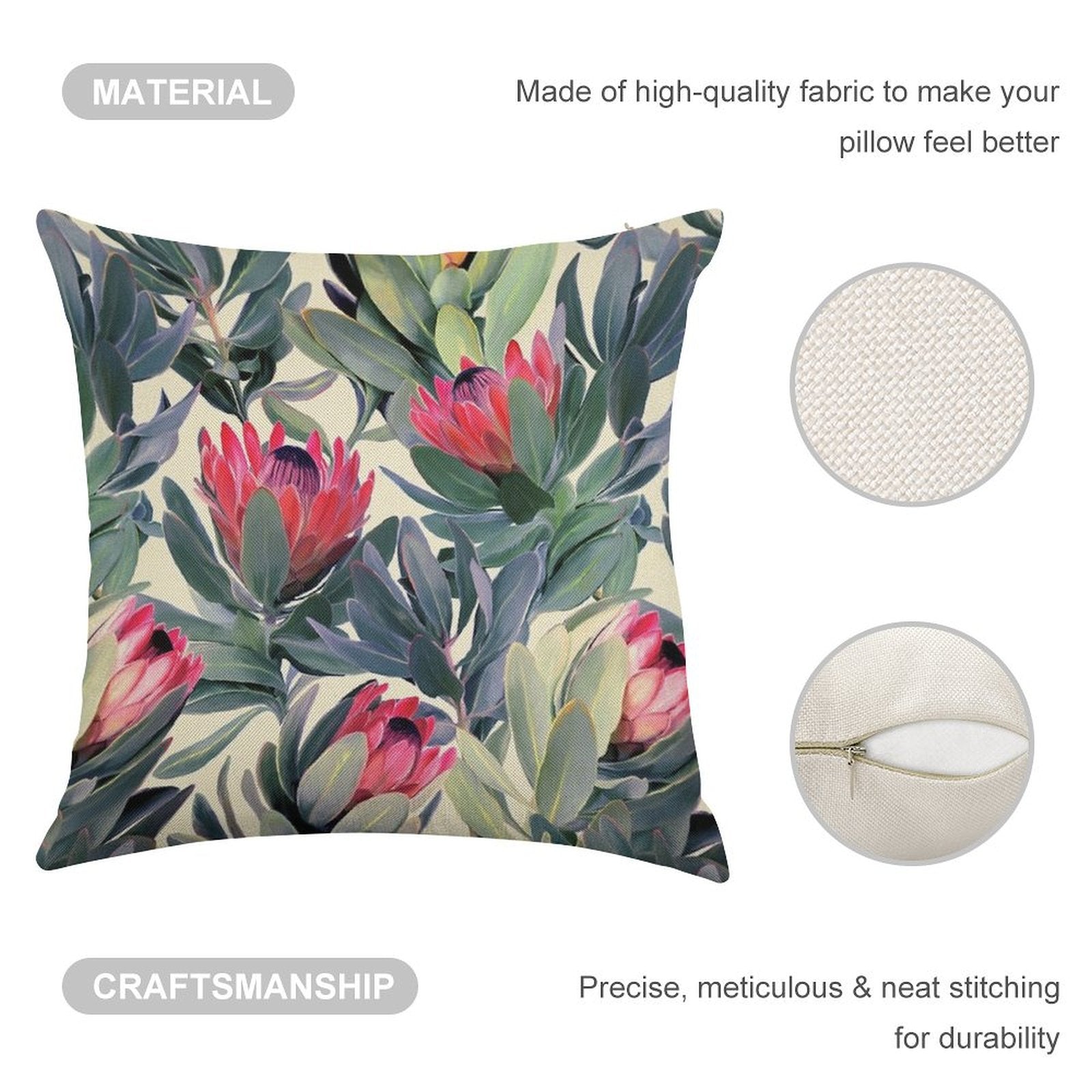 - Double-Stitched Edges: Precision stitching prevents fraying, stretching, and pilling, ensuring your Painted Protea Pattern Linen Throw Pillow Cover stays pristine through countless uses.