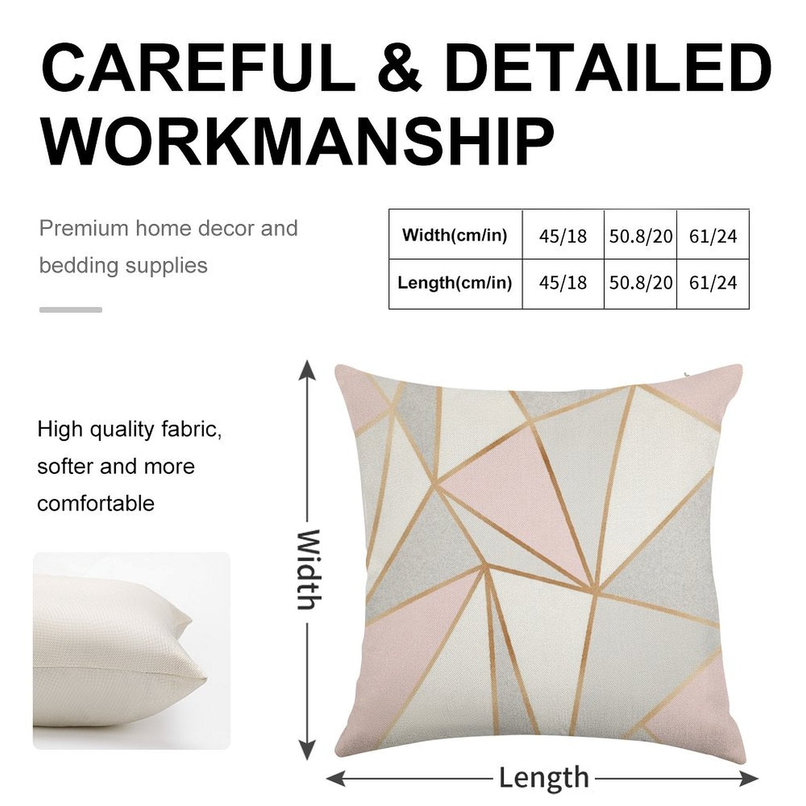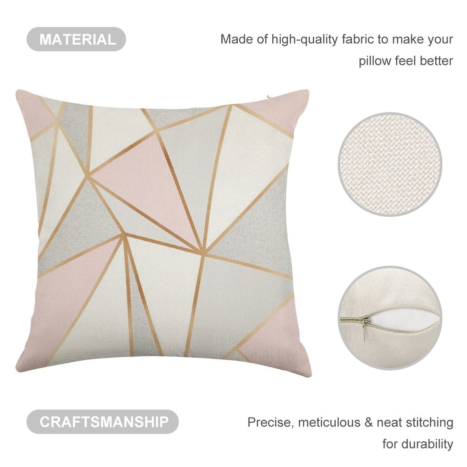 - Double-Stitched Edges: Precision stitching prevents fraying, stretching, and pilling, ensuring your Pink, Grey & Gold Geo Linen Throw Pillow Cover stays pristine through countless uses.
