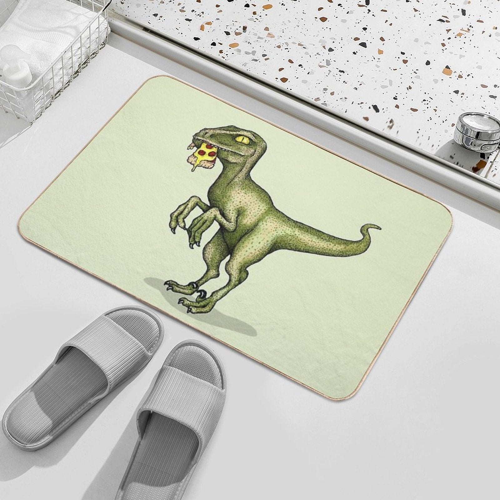 - Use as a vanity rug, guest suite accent, or mudroom defender – the Raptor Dinosaur Eating Pizza Slice Mat adapts to any space.