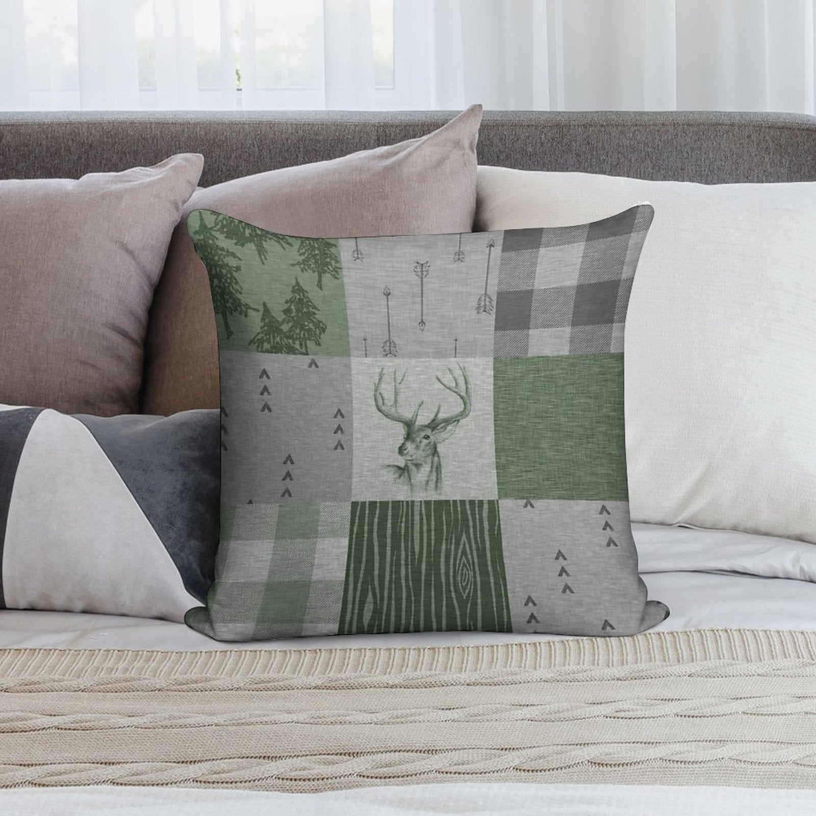 Rustic Deer Patchwork - GreenGrey Soft Fade-Resistant Throw Pillow