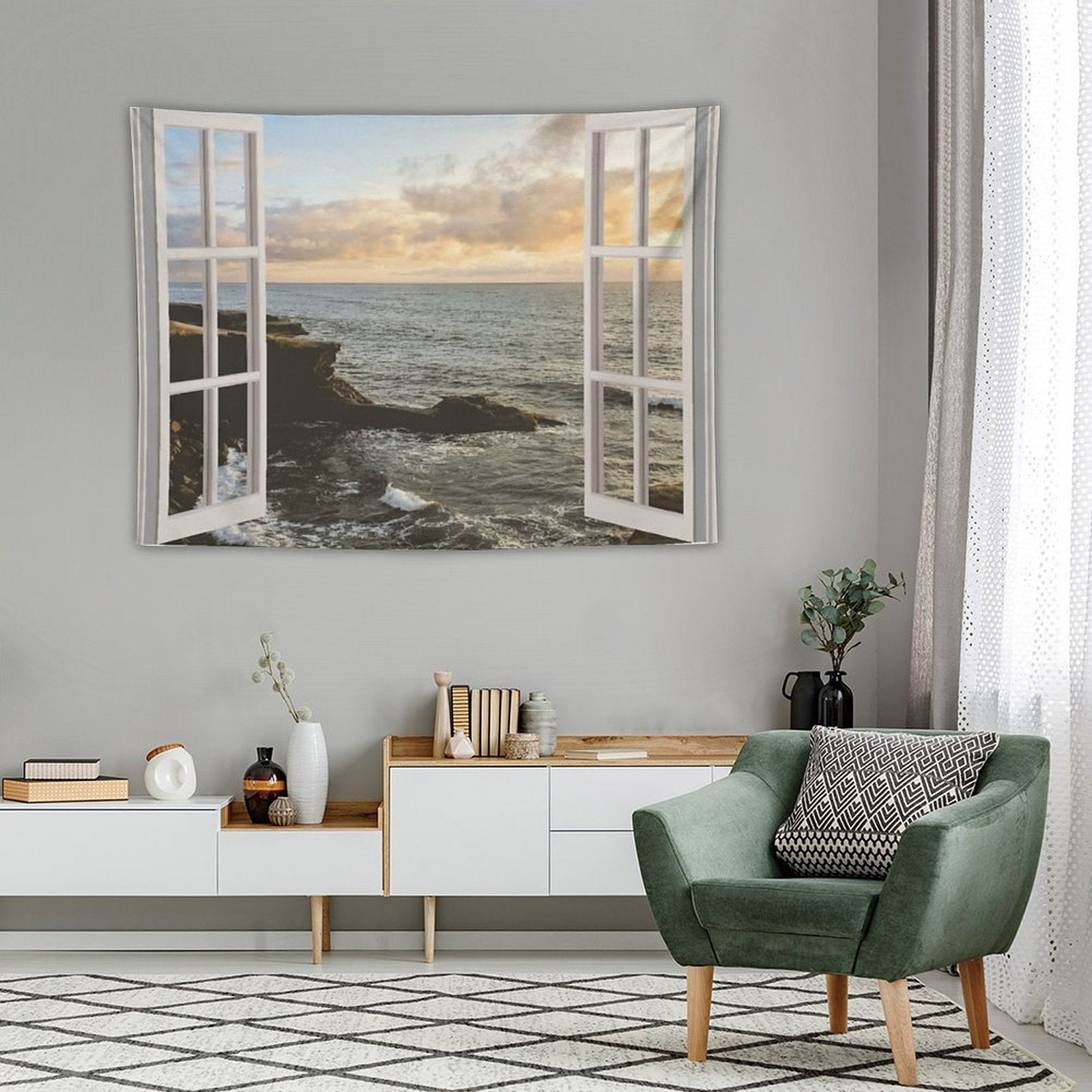 💝【Quality Material】"San Diego Window View Sunset Tapestry Tapestry" made of 100% polyester, bright colors, durable, lightweight, skin-friendly, soft texture, easy to hang or pack.