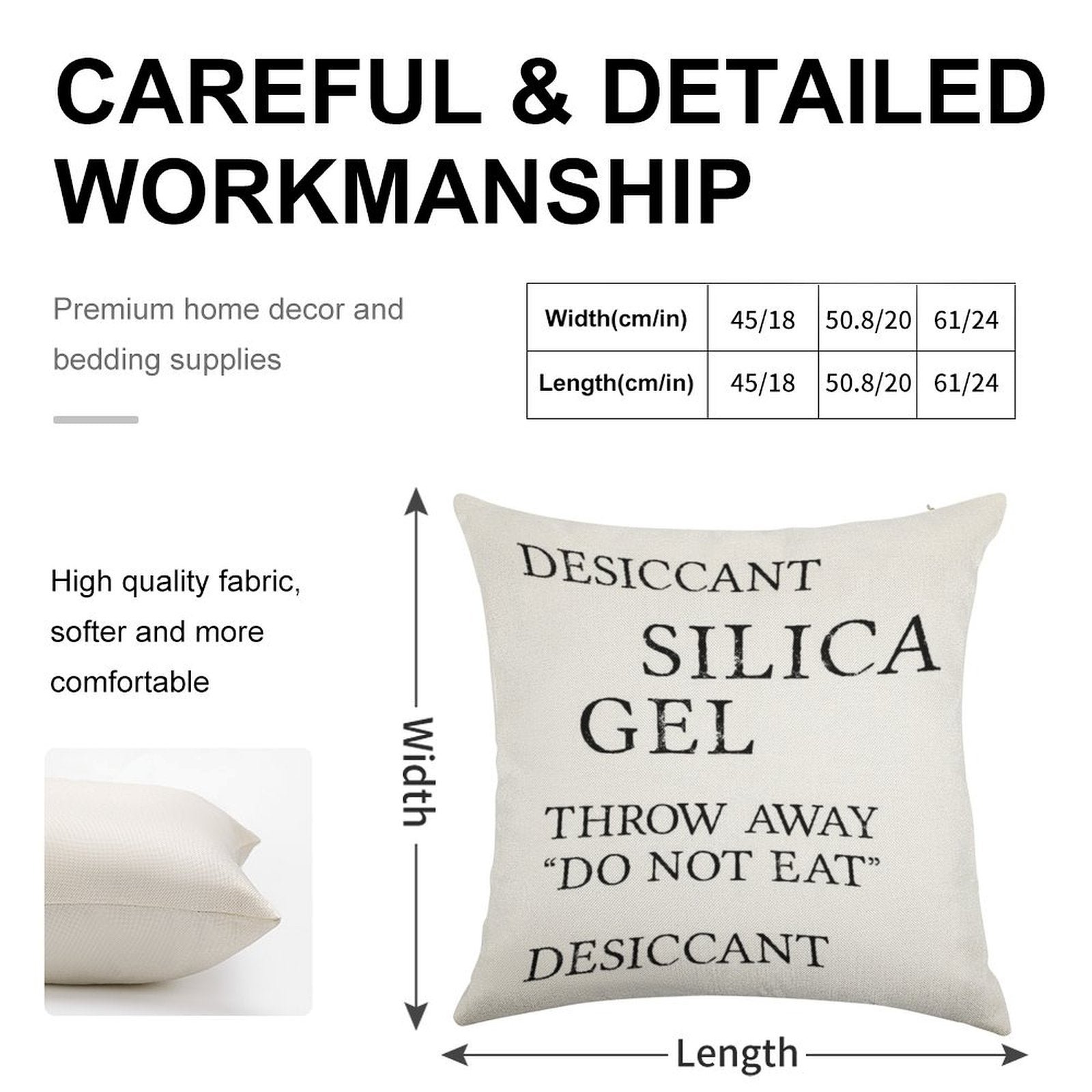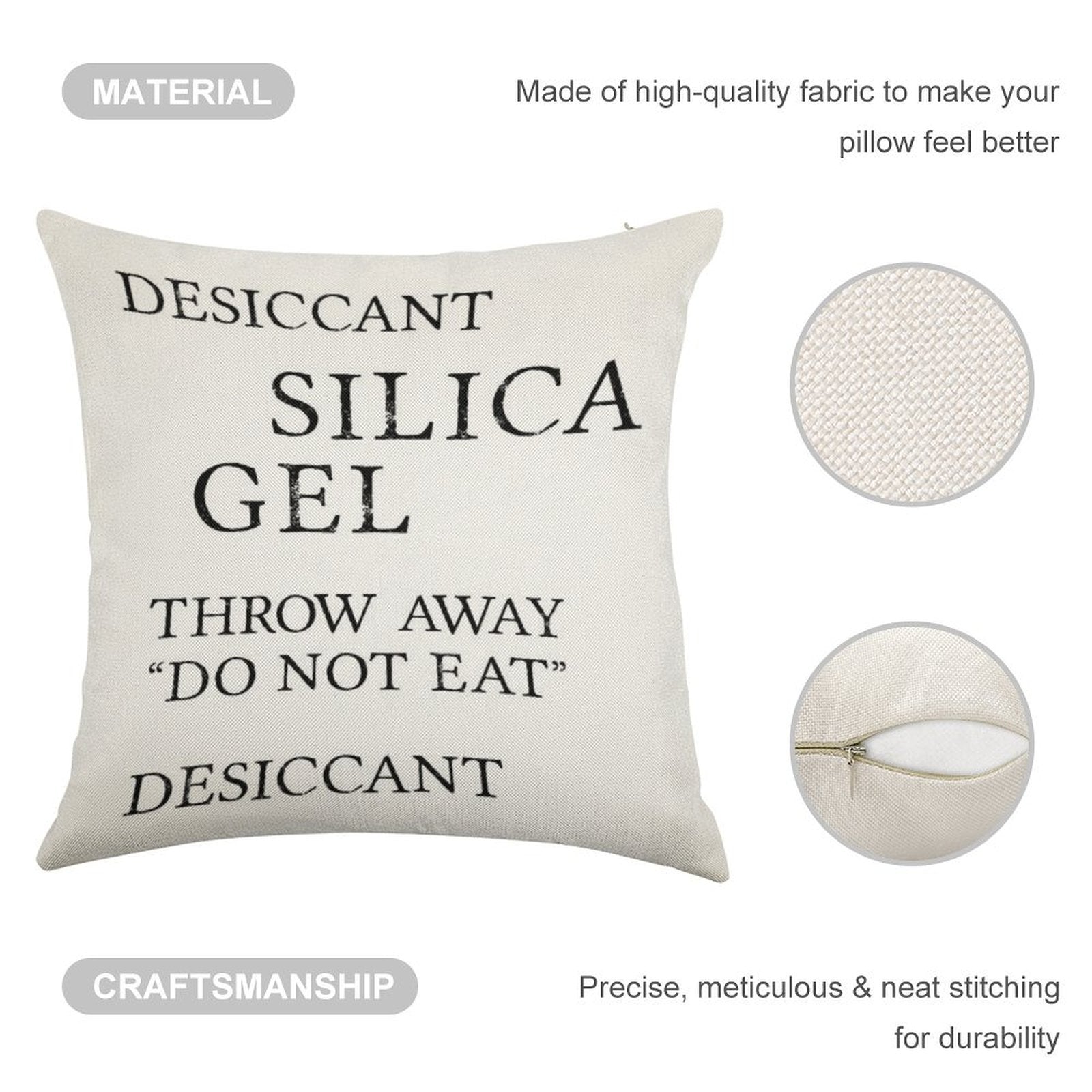 - Machine or hand washable (max 45°C). Avoid bleach and prolonged soaking to preserve the vibrant texture of your Silica Gel Desiccant Do No Eat (correct) Luxury Pillow Cover.