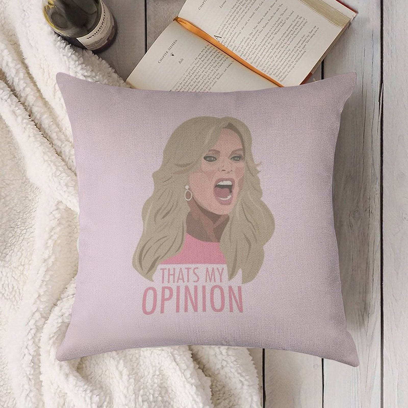 - Machine or hand washable (max 45°C). Avoid bleach and prolonged soaking to preserve the vibrant texture of your Tamra Judge Thats My Opinion Luxury Pillow Cover.