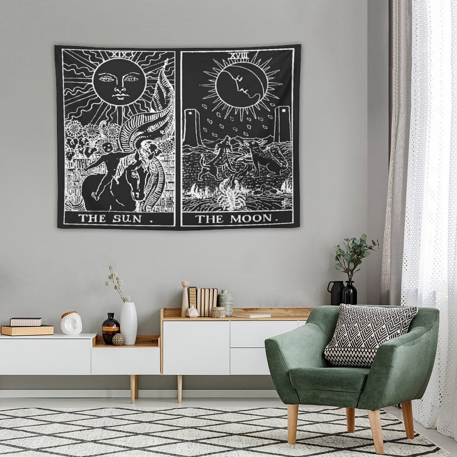 BionZax's The Sun And Moon Tarot Cards Pearl & Obsidian Tapestry for Bedroom, College Dorm. The Sun And Moon Tarot Cards Pearl & Obsidian Tapestry to decorate your bedroom, college dorm, living room, or kitchen wall, it is the best gift for funny, meme, aesthetic, trendy, simple, fashion, music, abstract, fantasy, modern tapestry for girls, men, boys, teen, women, kids.
