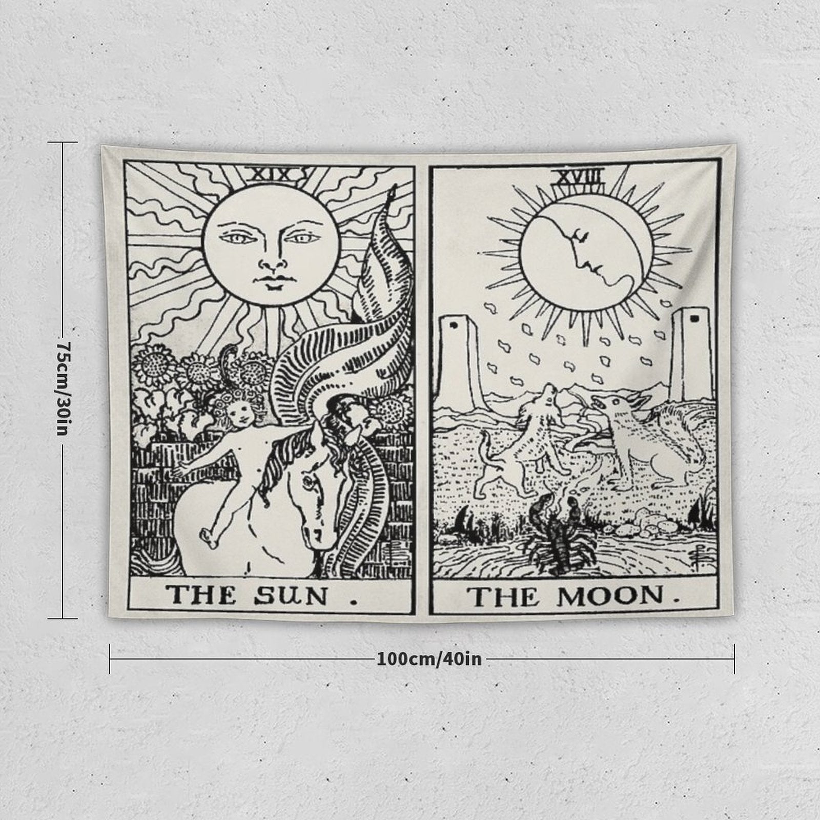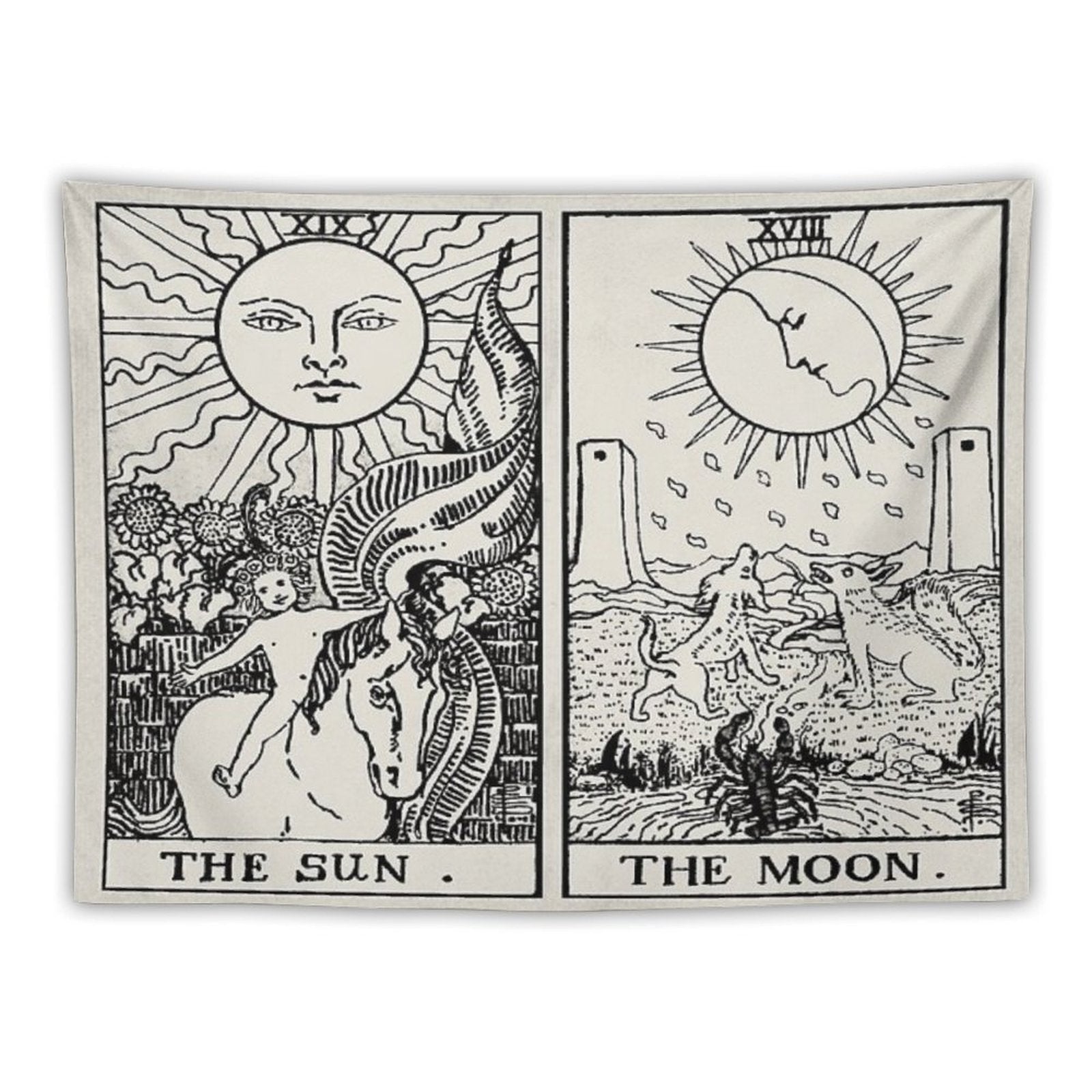 BionZax's The Sun And Moon Tarot Cards Tapestry for Bedroom, College Dorm. The Sun And Moon Tarot Cards Tapestry to decorate your bedroom, college dorm, living room, or kitchen wall, it is the best gift for funny, meme, aesthetic, trendy, simple, fashion, music, abstract, fantasy, modern tapestry for girls, men, boys, teen, women, kids.