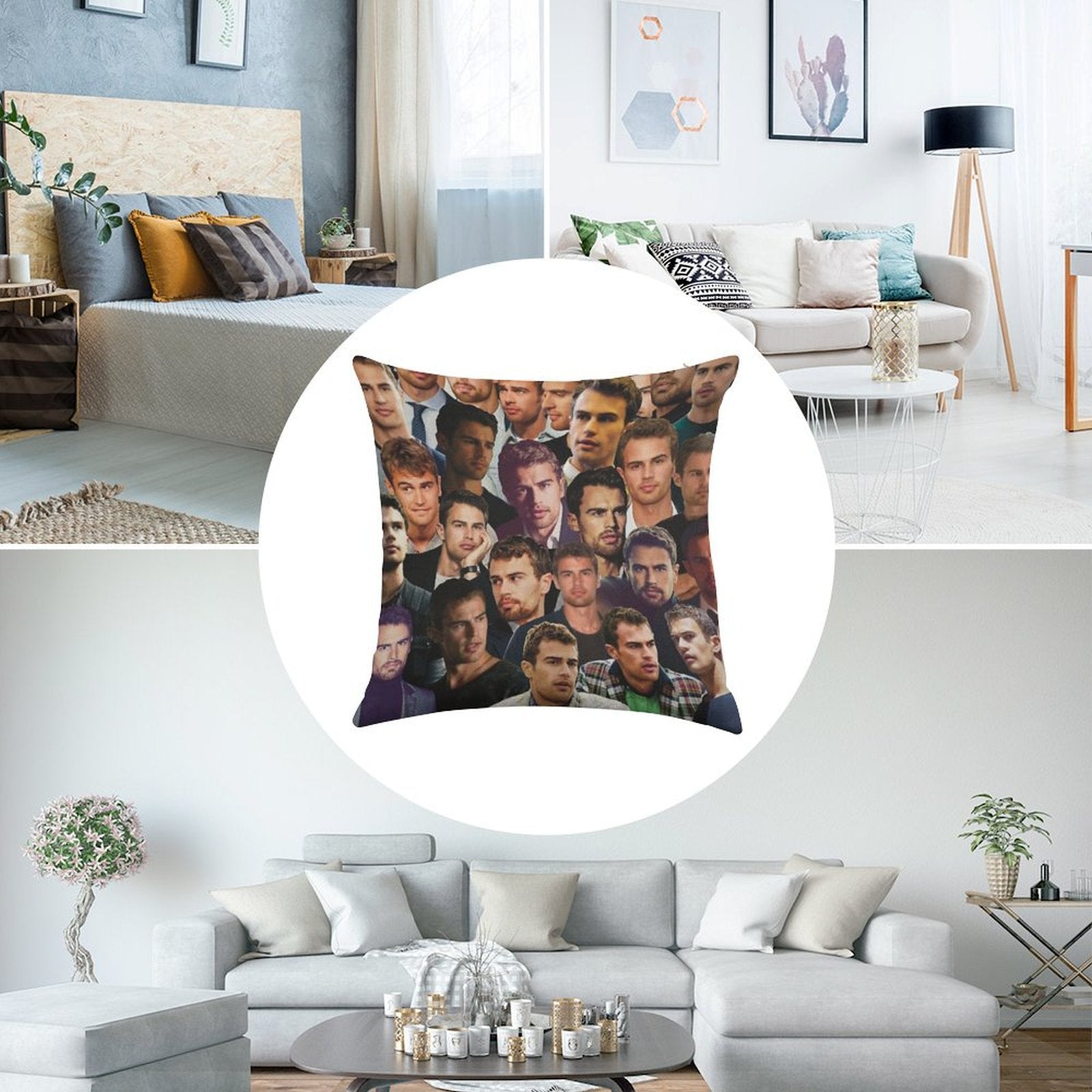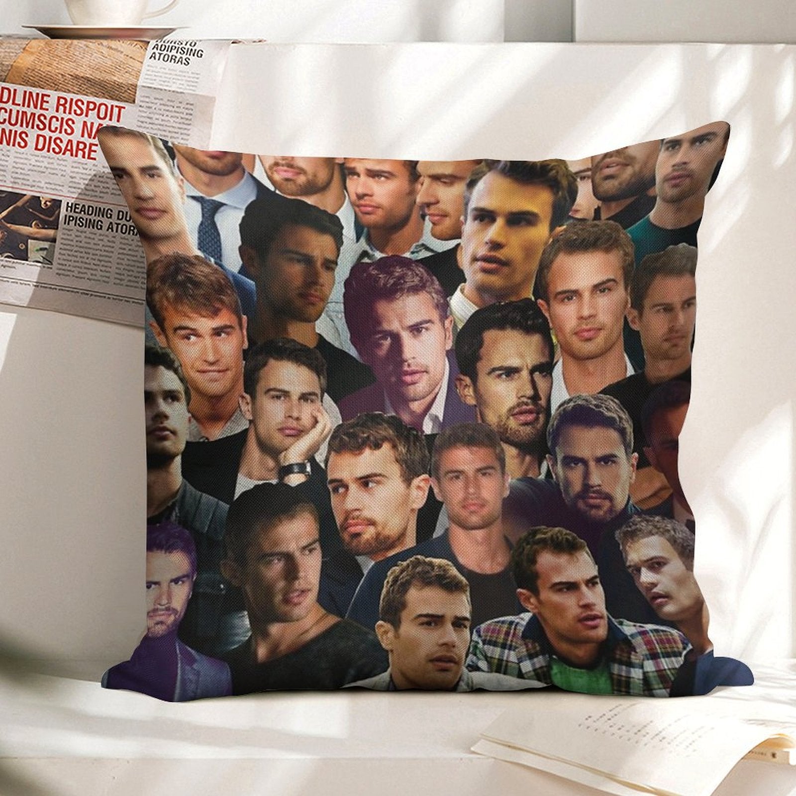 - Machine or hand washable (max 45°C). Avoid bleach and prolonged soaking to preserve the vibrant texture of your Theo James Photo Collage Luxury Pillow Cover.