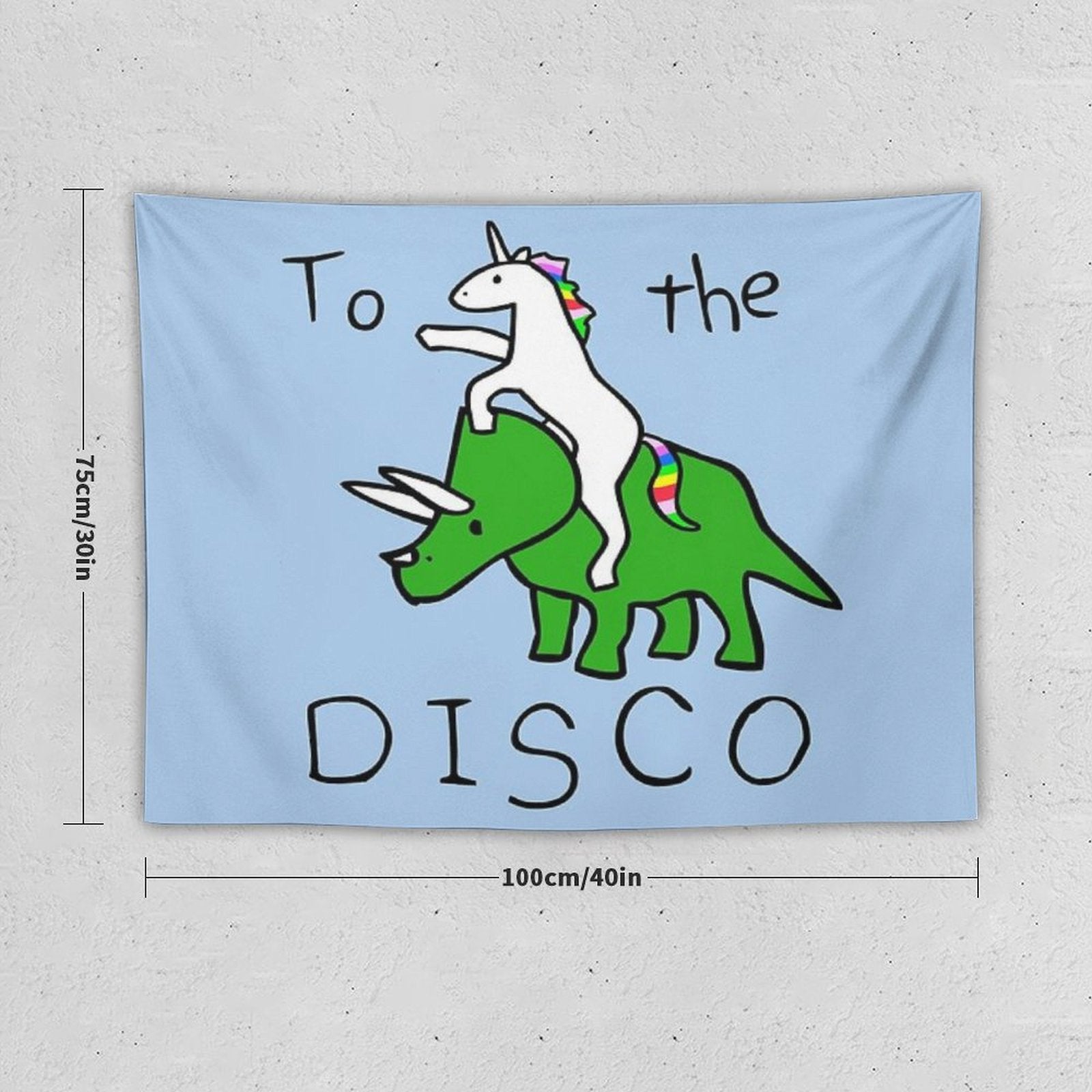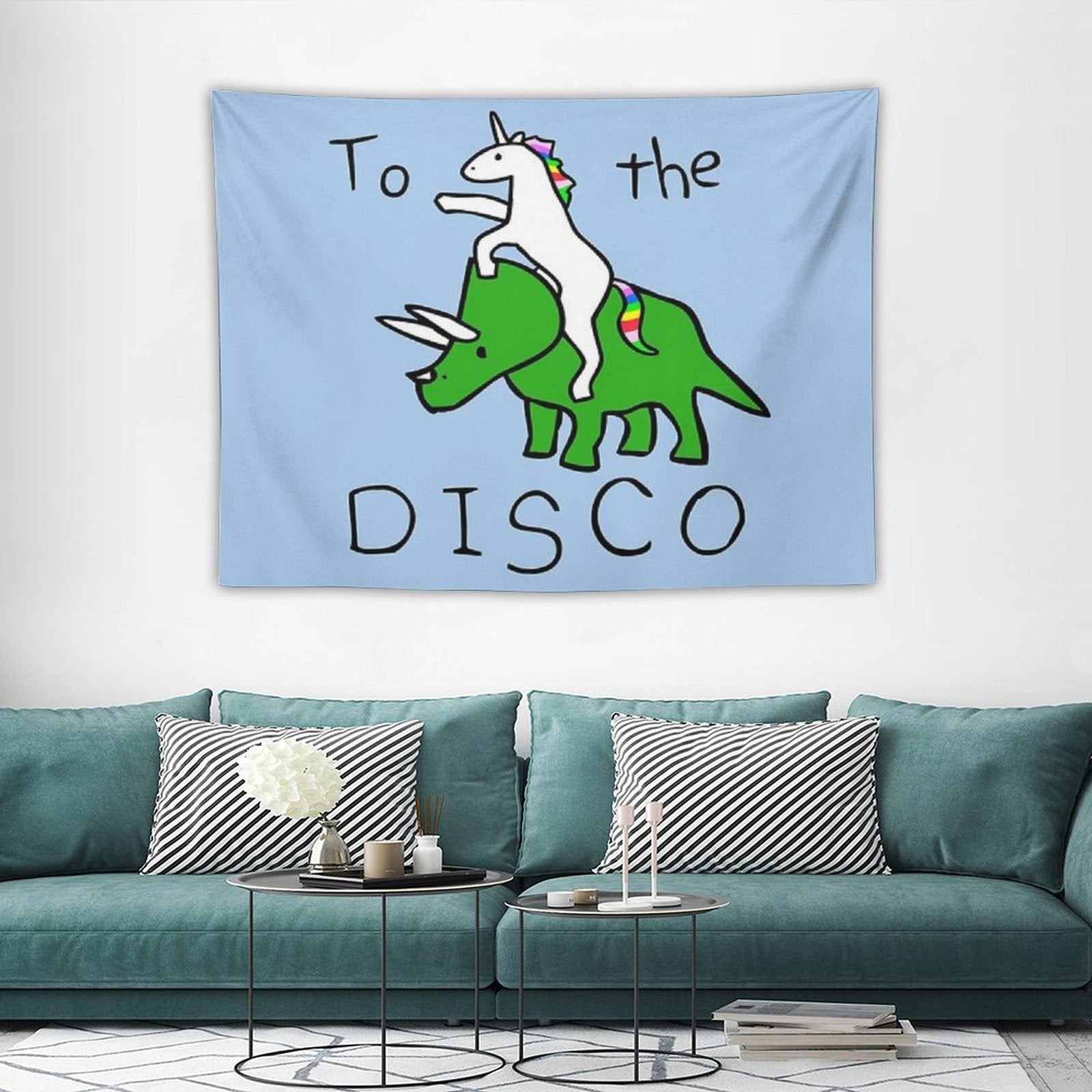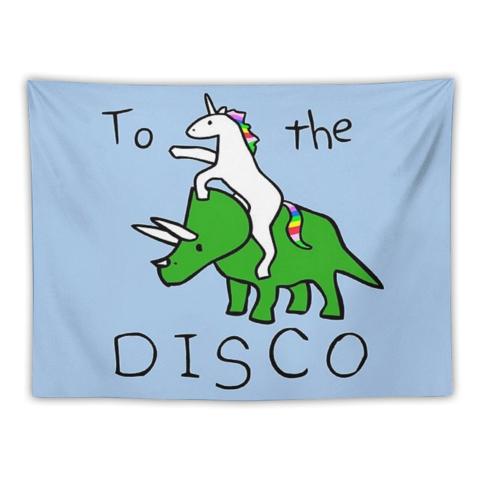 BionZax's To The Disco (Unicorn Riding Triceratops) Tapestry for Bedroom, College Dorm. To The Disco (Unicorn Riding Triceratops) Tapestry to decorate your bedroom, college dorm, living room, or kitchen wall, it is the best gift for funny, meme, aesthetic, trendy, simple, fashion, music, abstract, fantasy, modern tapestry for girls, men, boys, teen, women, kids.