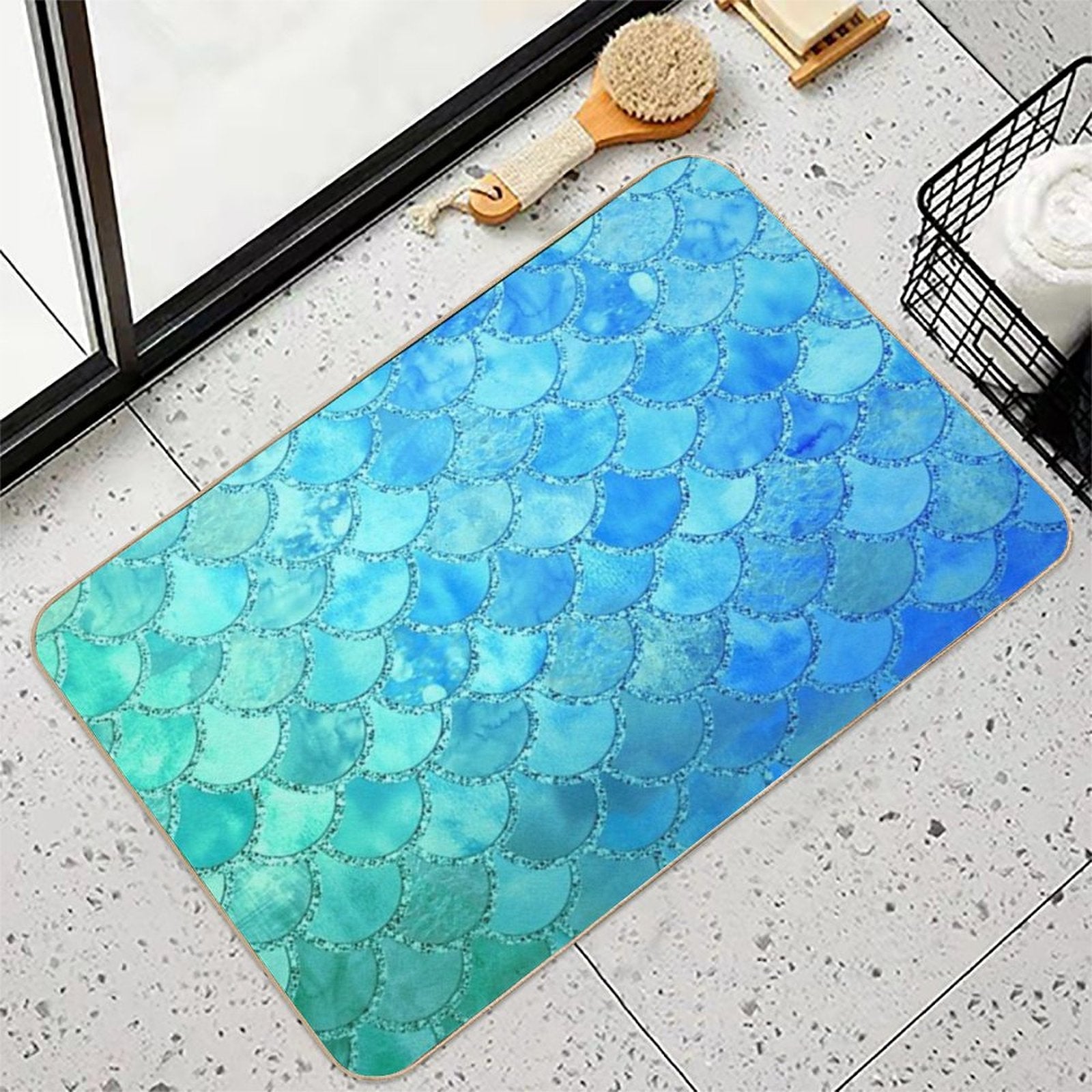 - Use as a vanity rug, guest suite accent, or mudroom defender – the Turquoise Green And BLue Watercolor Mermaid Scales Mat adapts to any space.