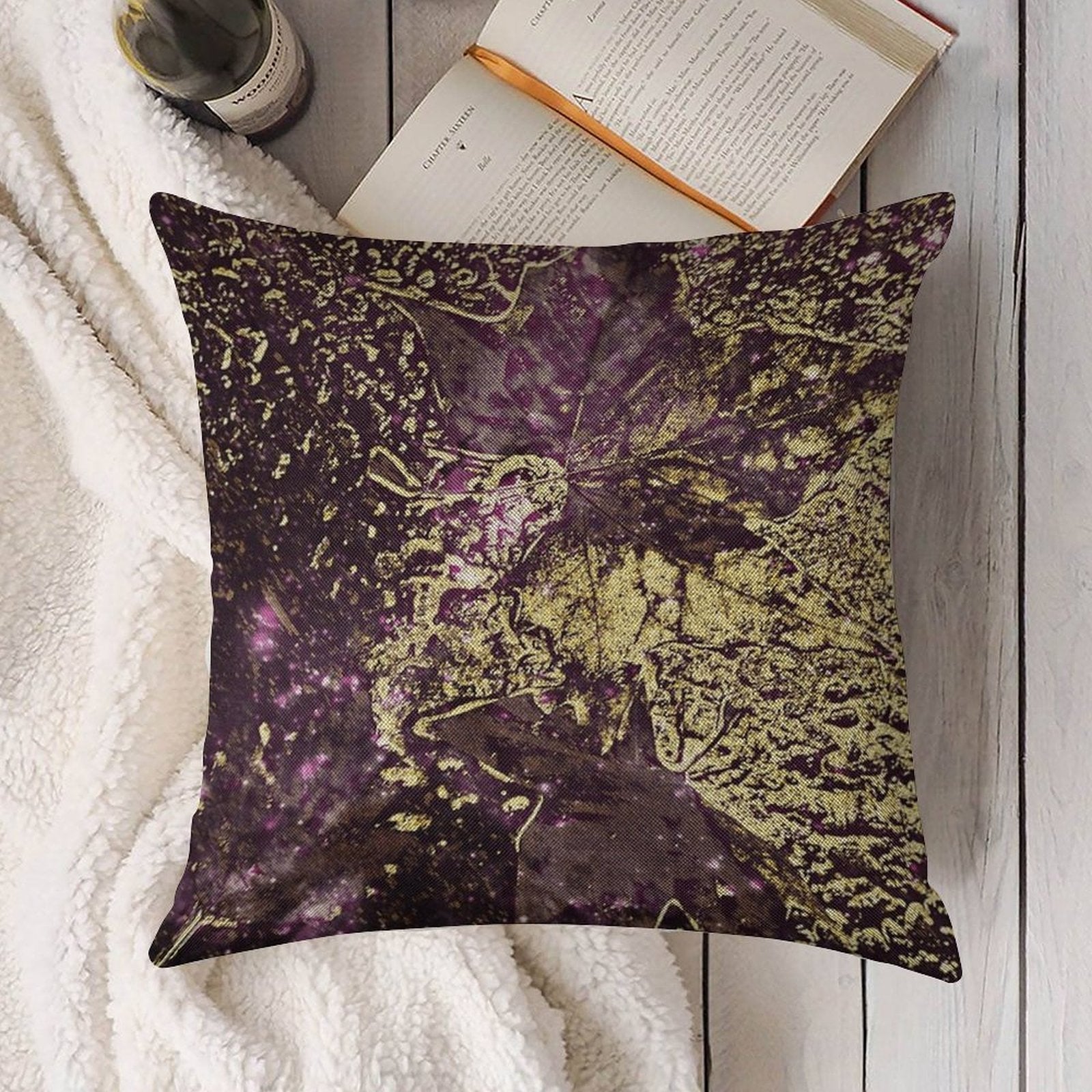 - Machine or hand washable (max 45°C). Avoid bleach and prolonged soaking to preserve the vibrant texture of your Two Purple Leaves in Melted Gold Luxury Pillow Cover.