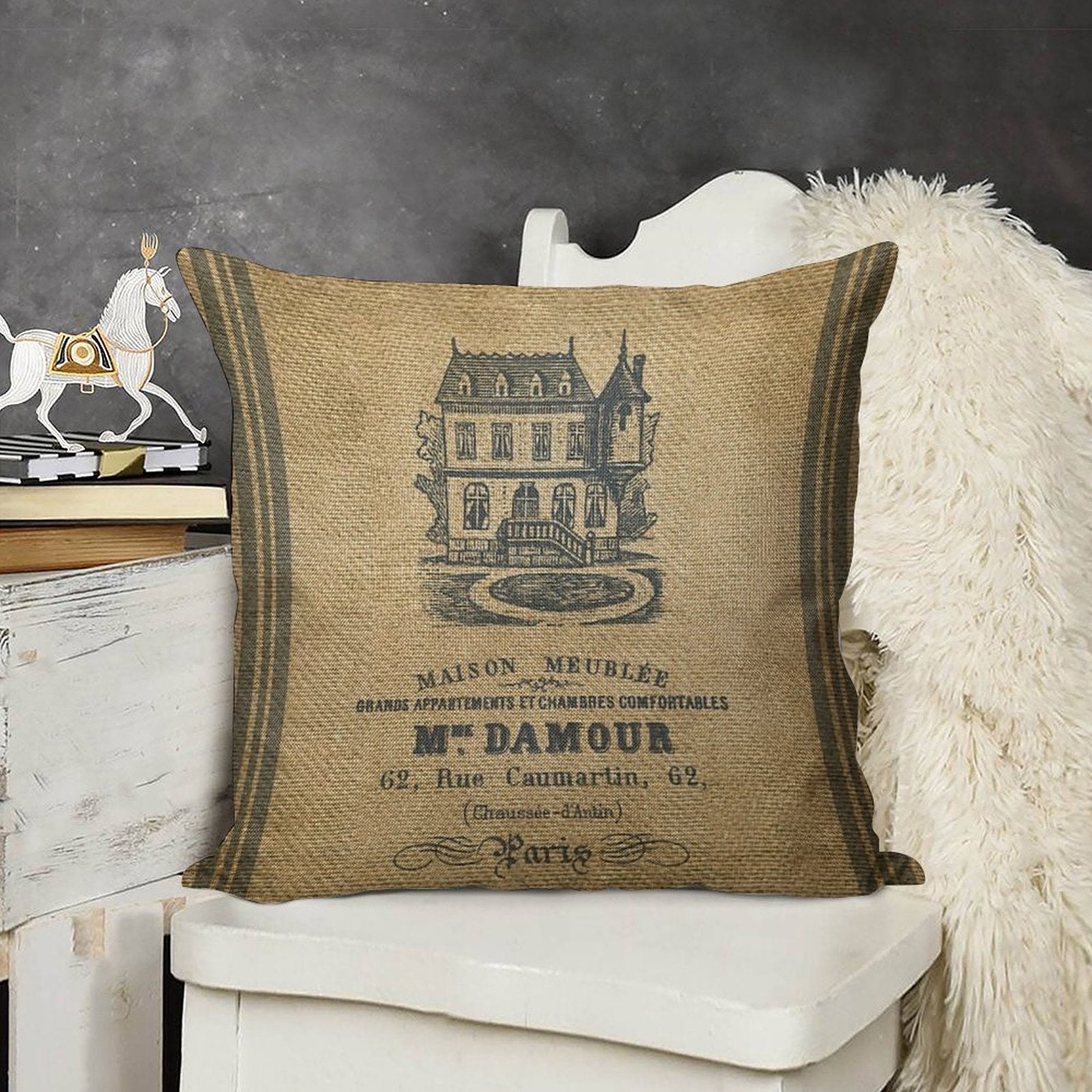 Vintage Burlap French House Design Linen Throw Pillow Cover