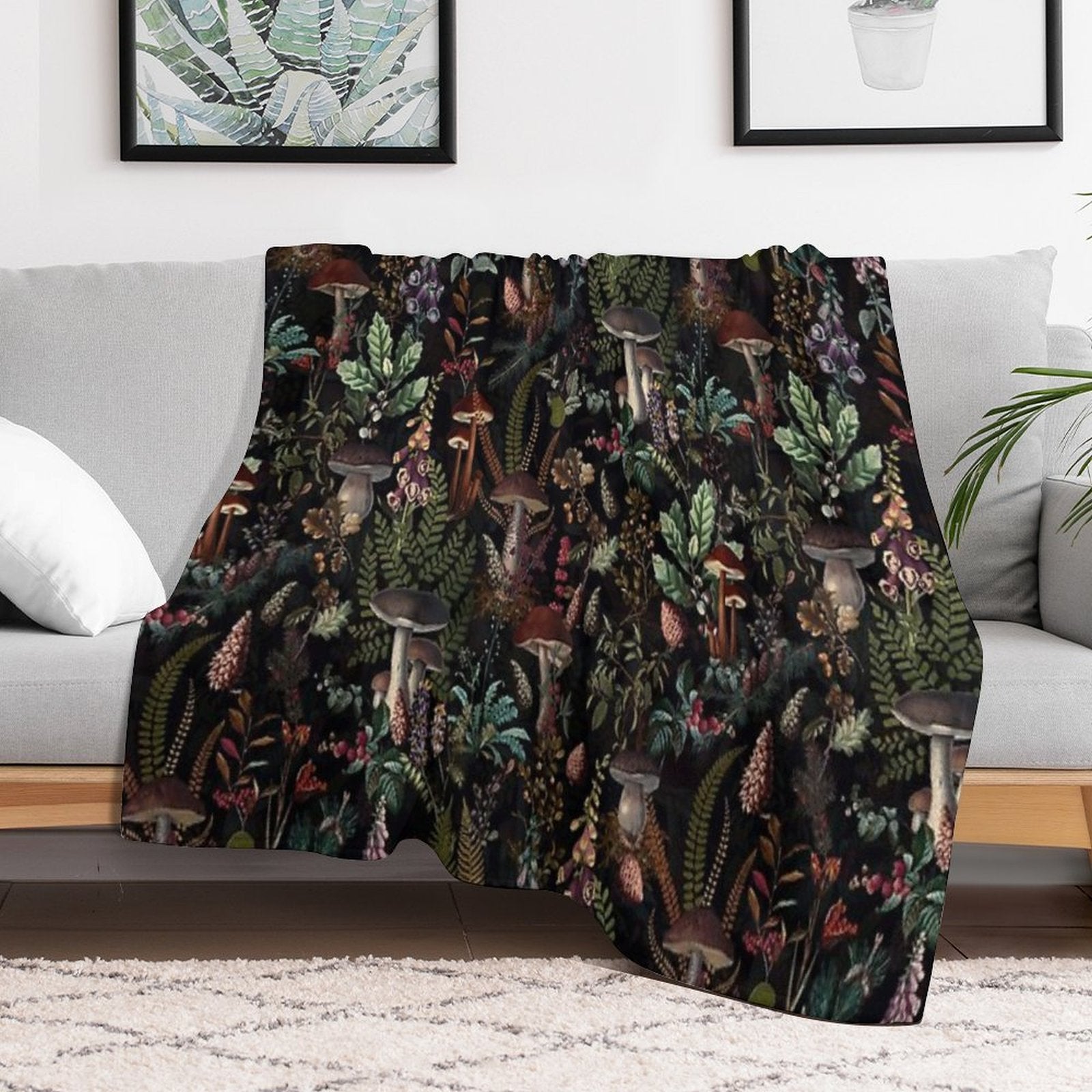 Vintage Mysterious Mushrooms Forest Botanical Botanical Night Garden Pattern NightGarden Throw Blanket